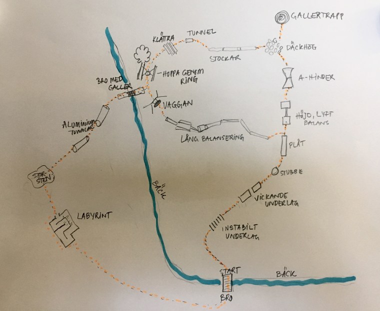 - Det handlar om att gå på instabilt underlag, gå på plåt, klättra över pallar, klättra över ett sorts A-hinder, klättra över rangliga däck, balansera på stockar, hoppa genom ett agilitydäck, balansera på en svajig bro, krypa genom ventilationsrör och en sorts skogstunnel och avsluta genom att ta sig upp på storstenen och betrakta utsikten.