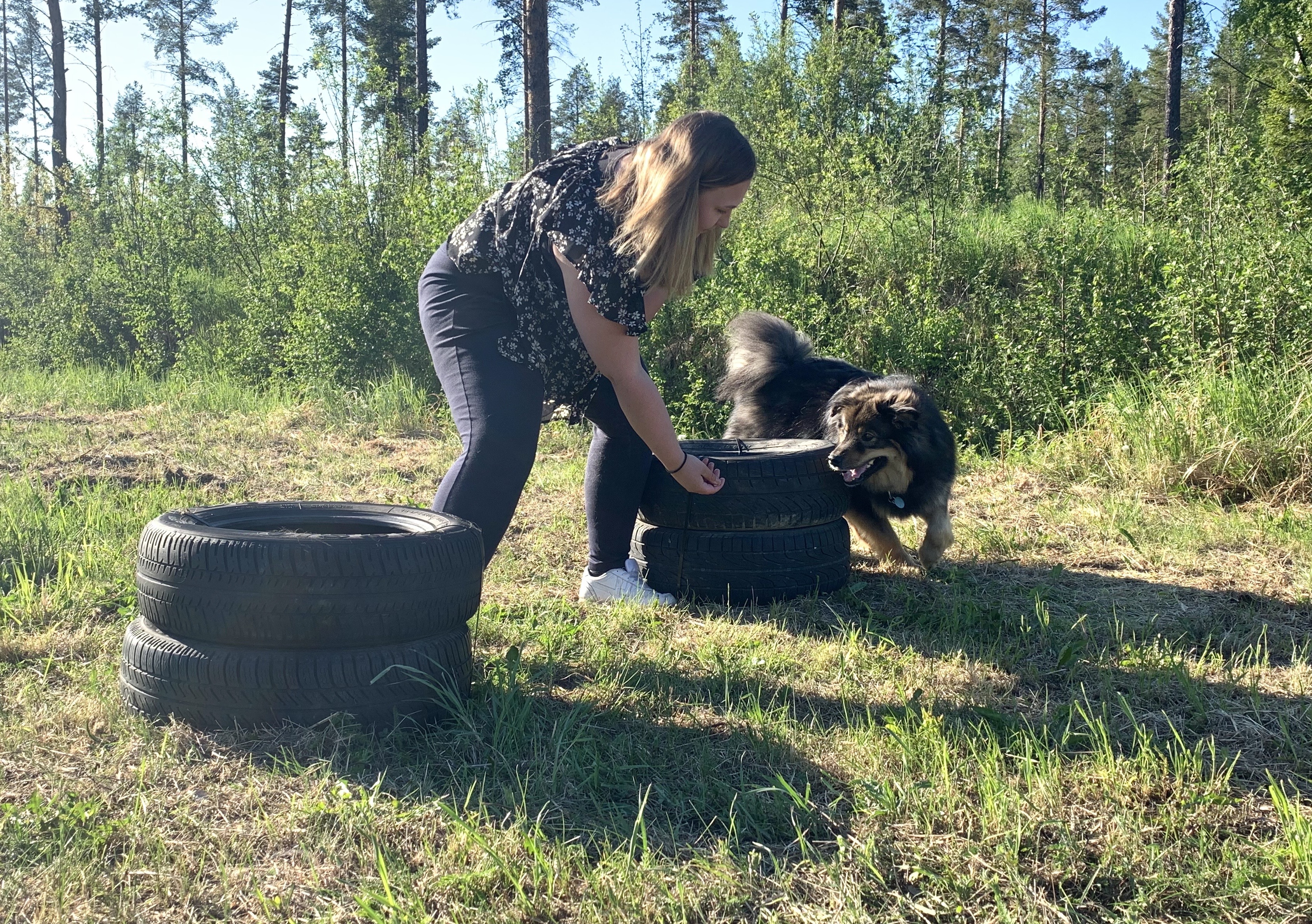 - Rambobanan: En bana som går runt i skogen där du och hunden ställs inför olika miljömässiga utmaningar som gör att hunden tränar upp sitt mod. Utmaningarna är hämtade från min tid som räddningshundförare. Här stör man inte varann lika mycket som i inhägnanden så här får alla vara, ingen kan boka den för egen träning.