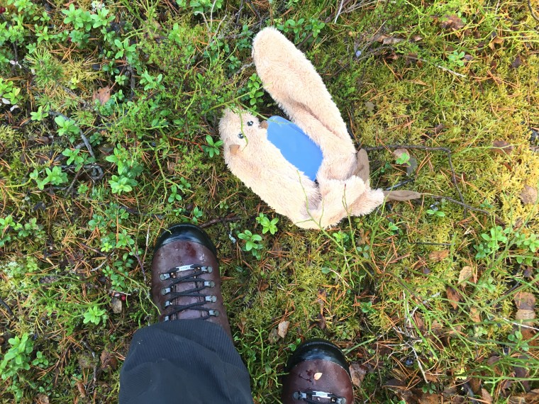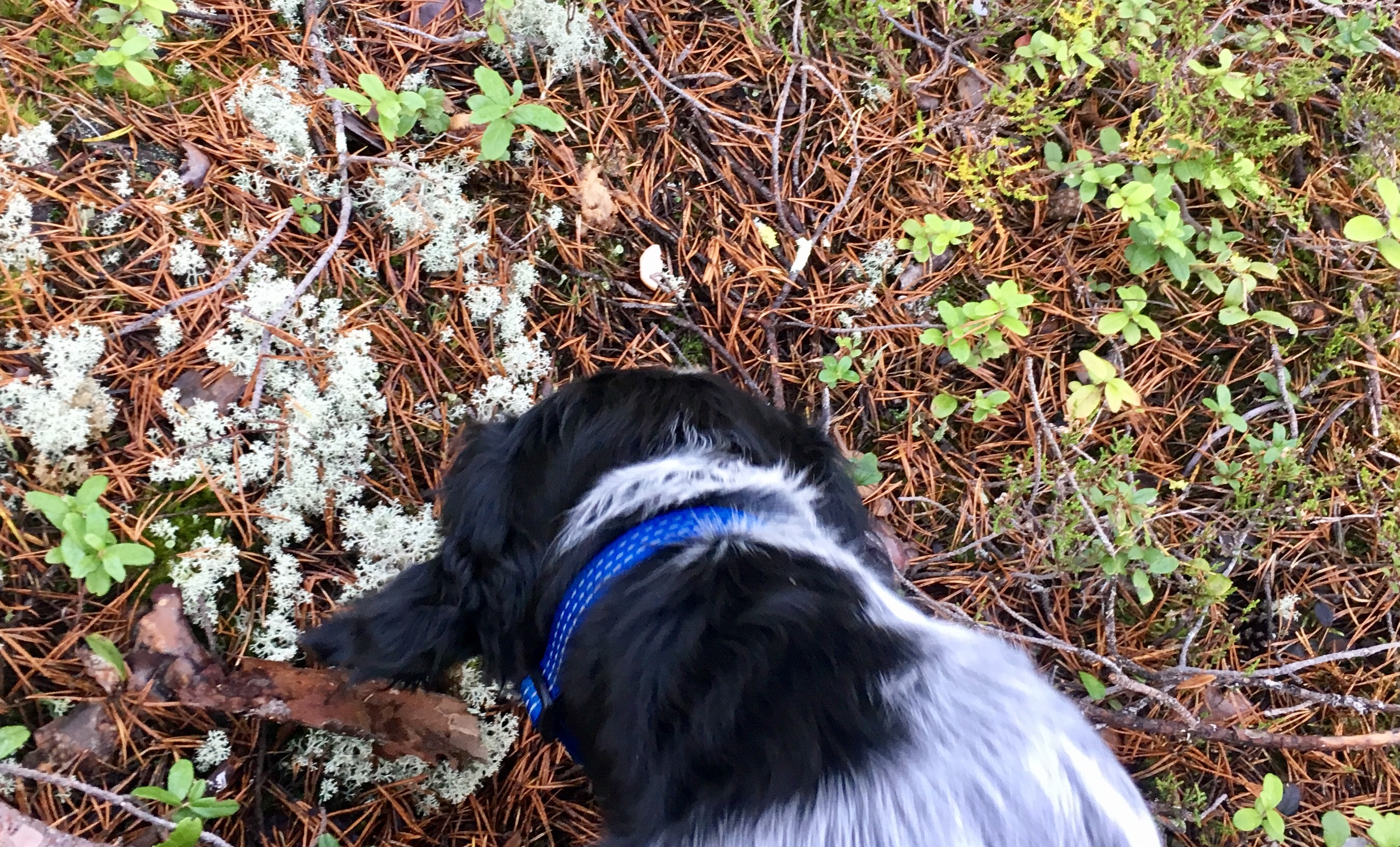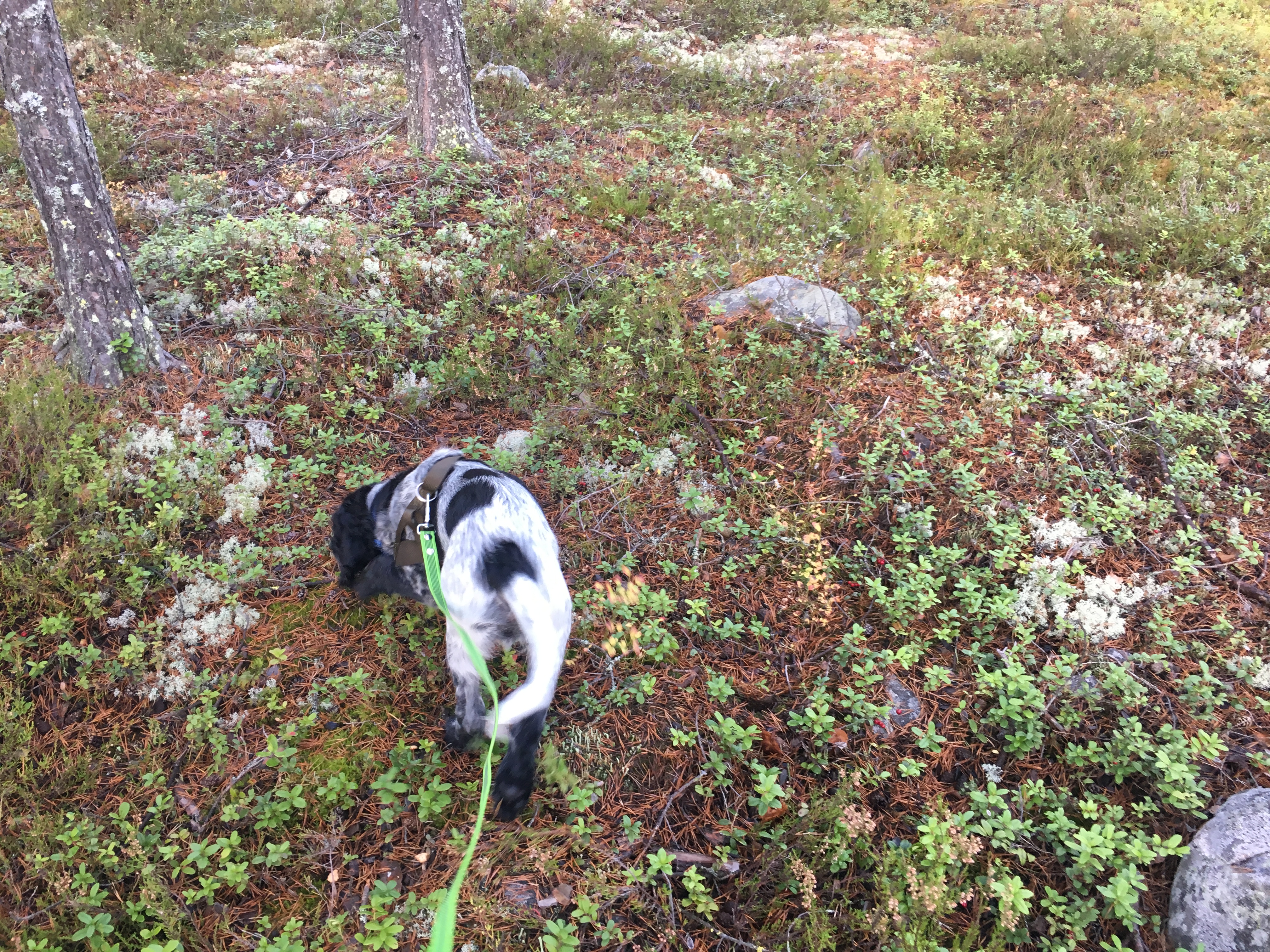 Skott hittar en godisbit och börjar tycka ett det här är ett intressant ställe. Han strosar vidare. Så håller vi på ett bra tag. Strosar i sakta mak, hittar någon godisbit, funderar, lyssnar på den jobbiga hackspetten som stör, sedan strosar vi vidare.