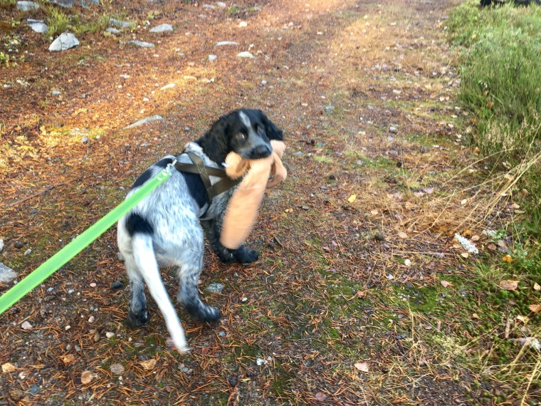 Vi börjar närma oss första pinnen och jag är väldigt nyfiken på hur det ska gå. Det här avslöjar ganska mycket om vilken typ av hund jag har, vilka gåvor han har. Skott stannar och nosar på pinnen. Jag berömmer med rösten. Han plockar upp den och viftar på svansen! Yes, bästa tänkbara scenario. Sedan är han egennyttig om pinnen och vill inte att jag kommer och tar i den för att kampa. Nåja, det löser vi sen =)