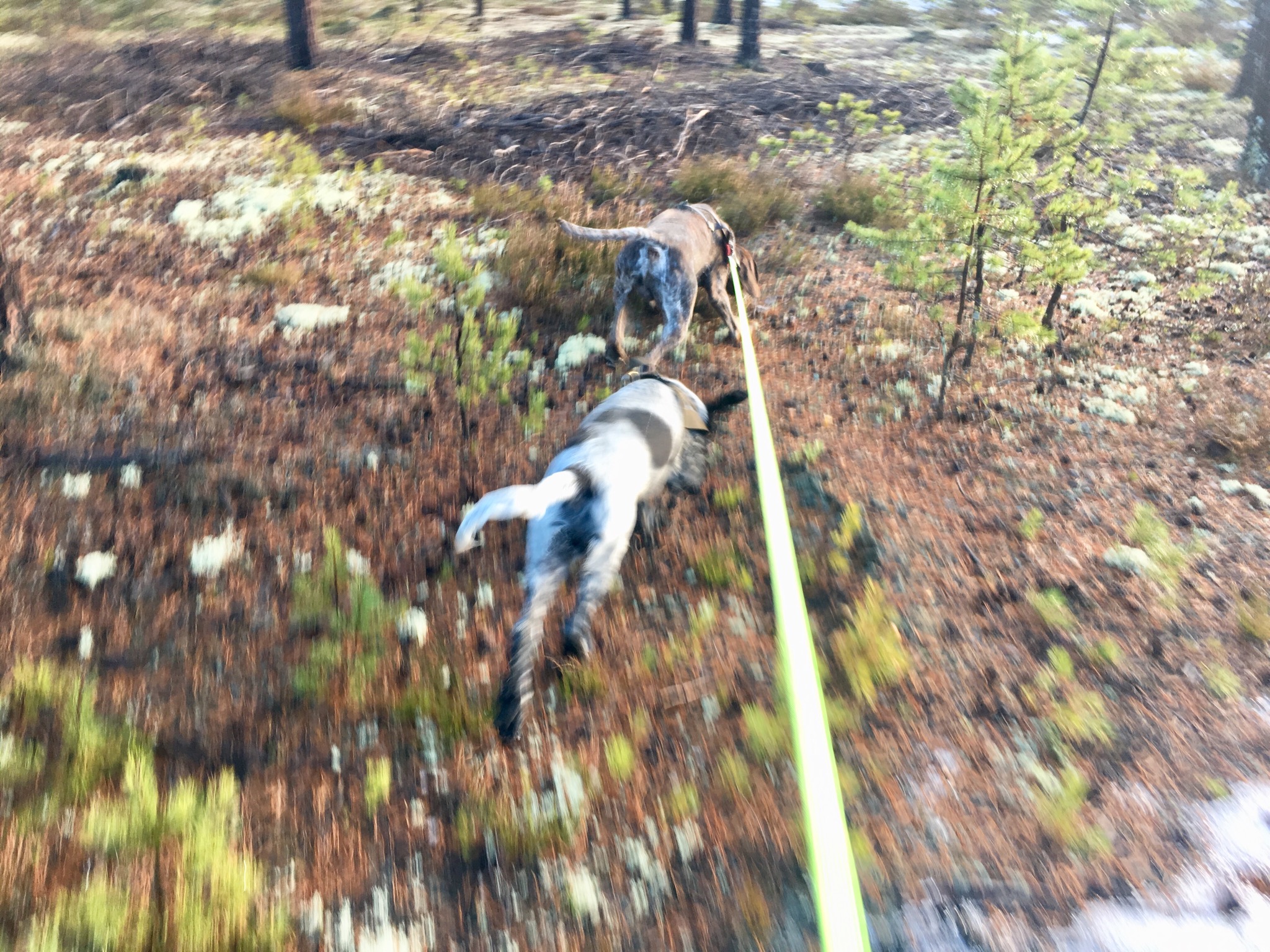 Så nu har jag lagt tre spår som egentligen är till Hagel, men kryddade med lite extra godsaker längs vägen. Sedan har jag spårat med Hagel i lina, och Skott har fått haka på lös bredvid. Hagel bryr sig ju inte ett smack om störningen, han är väldigt målmedveten i spåret. Och vet du vad – det har blivit succé! Nu hänger Skott med tryggt och nyfiket, han spårar allt vad han kan för att hänga med Hagel. Någon gång tyckte sig inte Hagel ha tid att plocka upp en pinne som jag lagt i spåret, men då hittade Skott den istället och fick beröm. Så det blev en perfekt konkurrenssituation som sporrade dem båda att göra sitt bästa. Kul! Det kan du se på filmen från vårt senaste spår.