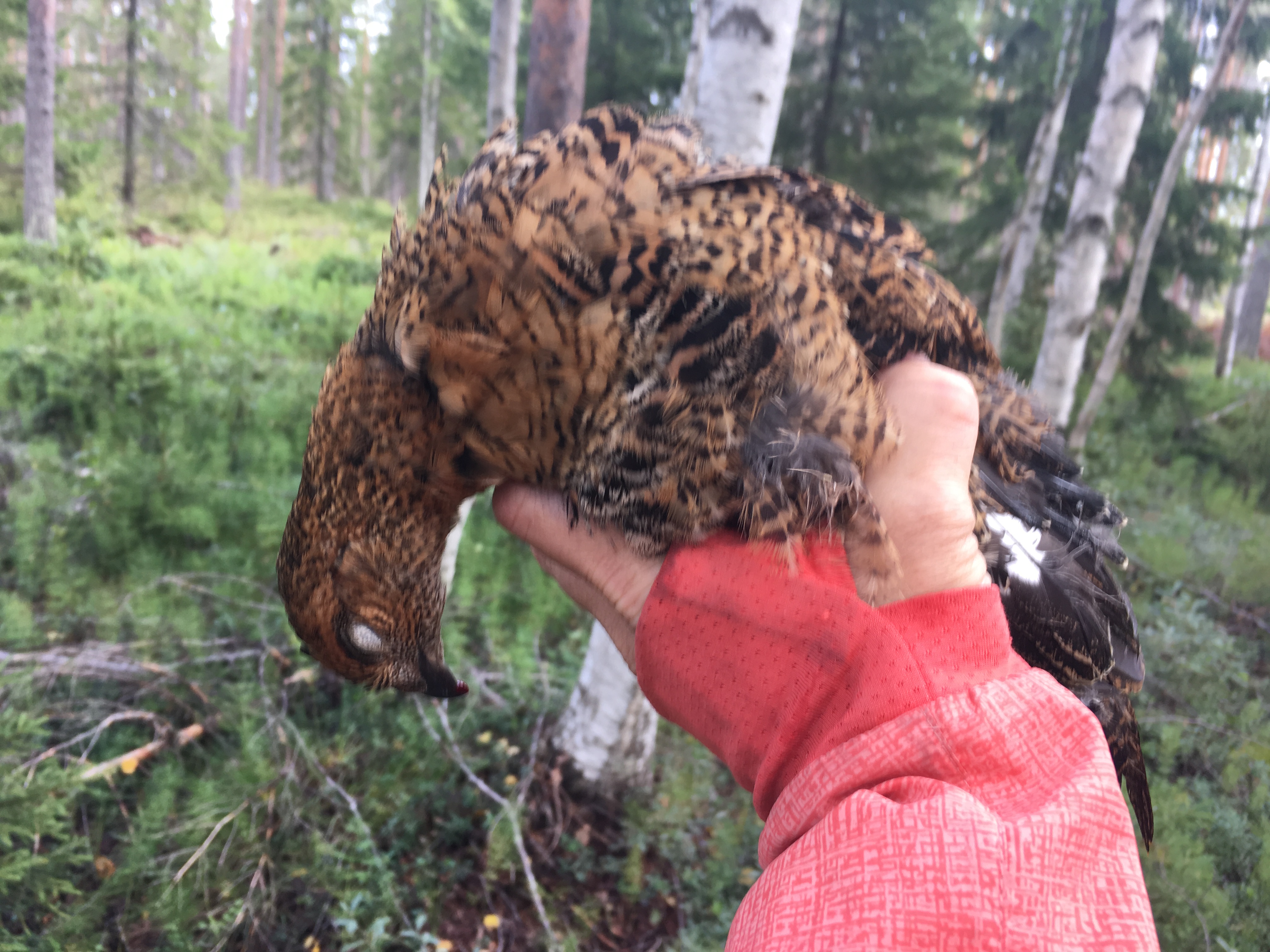 Lite senare var det Skotts tur. Samma procedur. Jag parkerade honom vid vägkanten, gick och pillade i uppsparket, sedan släppte jag på honom. Jag tror att han kände av min nervositet, han blev smygande i starten, som om han nästan stod för fågeldoften. Ånej, skulle det bli strul nu? Men snart kom han igång och spårade iväg i ett bra tempo, hittade fågeln och kom tillbaka med den och avlämnade snyggt. Puh!