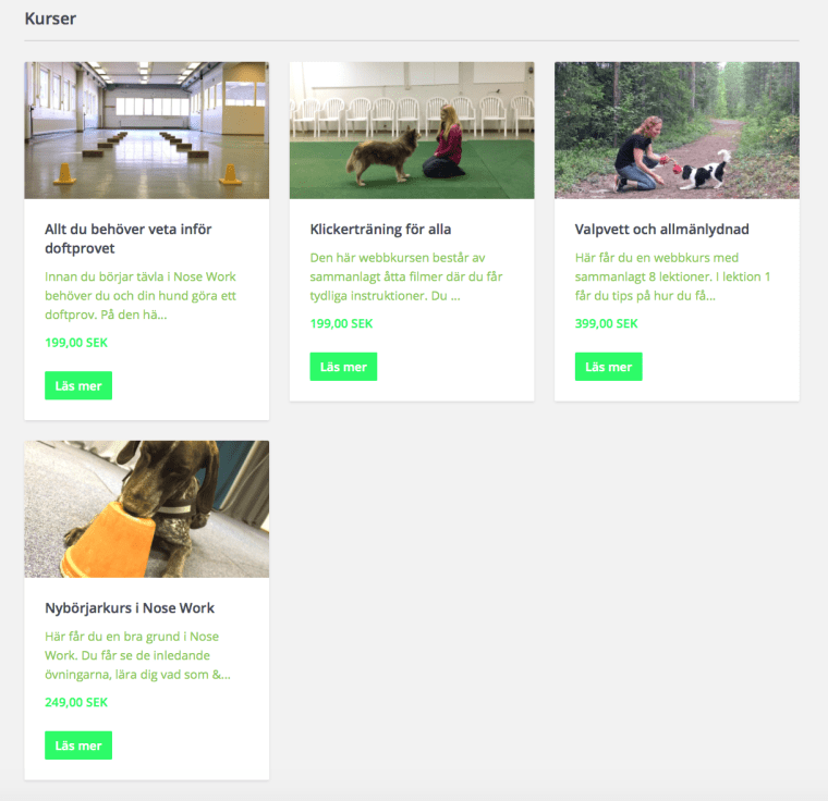 Gå in på https://susanne-lindberg.mykajabi.com och kolla in vilken kurs du ska nappa på när det blir halva priset. Jag har allt från nybörjarkurser i Nose Work till doftprovskurser, bli vass på att tävla Nose Work-kurser, klickerkurs, uppletandekurs och valp- och allmänlydnadskurs. På samtliga kurser kan du se en trailer innan du bestämmer dig för att köpa den. Kurserna innehåller flera korta filmer där jag tydligt visar och berättar hur du ska träna. De har fått bra recensioner.
