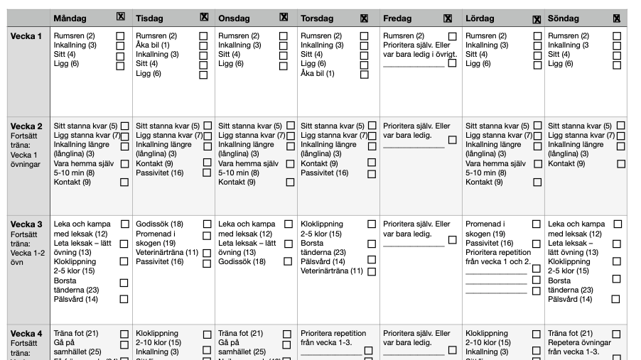 Min tanke med schemat är att det ska komplettera Valpkortleken med 55 övningar och ge en konkret start för dom som vill ha tips, stöd och en bra rutin för att komma igång. Här kan du läsa mer om Valpkortleken. Efter varje rubrik i schemat står en siffra inom parentens, den siffran anger vilket kort i kortleken som du ska scanna med mobilen för att få se en tydlig, pedagogisk film på hur övningen ska göras och kan utökas.