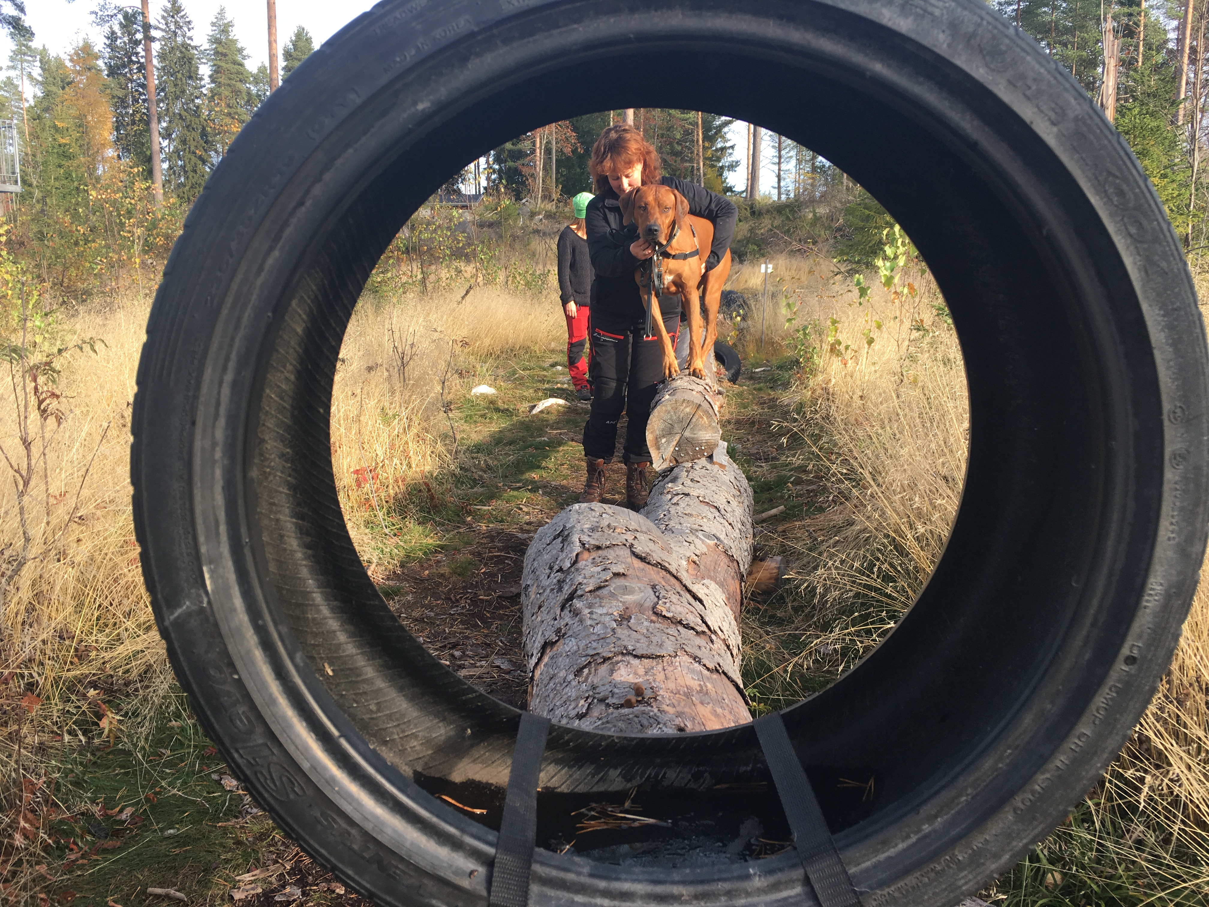 - Rambobanan: En bana som går runt i skogen där du och hunden ställs inför olika miljömässiga utmaningar som gör att hunden tränar upp sitt mod. Utmaningarna är hämtade från min tid som räddningshundförare. Här stör man inte varann lika mycket som i inhägnanden så här får alla vara, ingen kan boka den för egen träning.