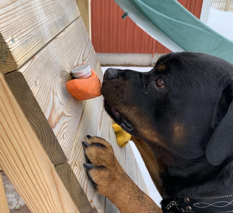 ”Jag tycker den var rolig. Så många bra och spännande idéer och nytt tänk från vår sida. En boost i nosarbete helt enkelt. Blir perfekt att använda då vi ska göra vår första NW tävling om ett par veckor. Jag kommer mer än gärna rekommendera den för andra, gjorde det redan när jag fick den till vår kursledare men hon hade redan köpt den. Min hund heter Asko och är en 2.5 årig rottiskille som älskar att nosa. Han kan dofterna: eukalyptus, lagerblad, lavendel, ammunition, röd kong (självklart även löptikar å annat som han tycker är intressant ute).” Charlotta Ericsson, Mora.