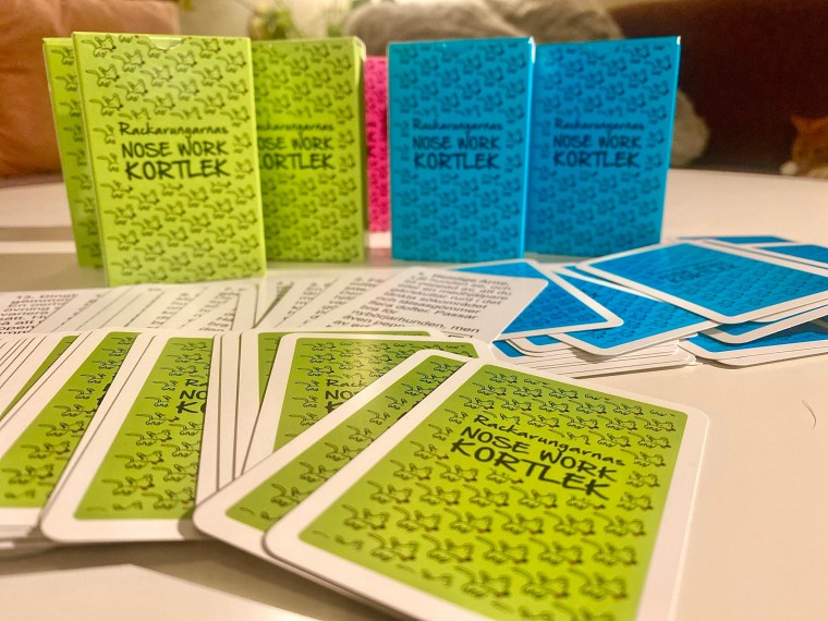 ”Rackarungarnas nosework-kortlek har gett oss och våra hundar massor med tips och kommer hjälpa oss att variera vår träning och öva på olika svårigheter som kan dyka upp. Kortleken har även inspirerat oss till att hitta på våra egna övningar, helt annorlunda upplägg eller som en variant på föreslaget tema.”