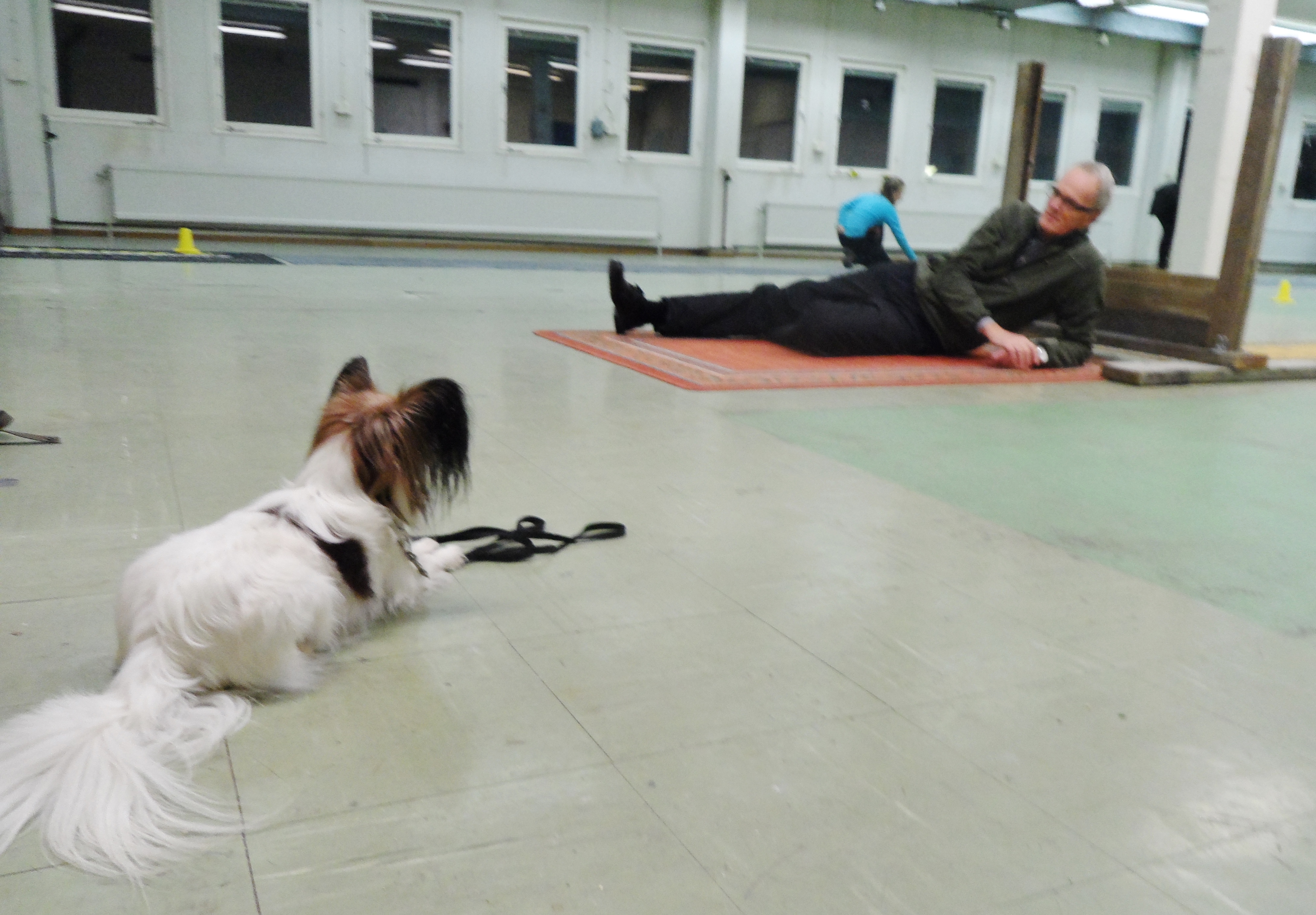 Vi övade bland annat på sitt kvar och ligg kvar, samtidigt som matte eller husse gjorde lite knasiga övningar som hundarna skulle motstå och bara lugnt sitta eller ligga kvar. Det gick finemang.