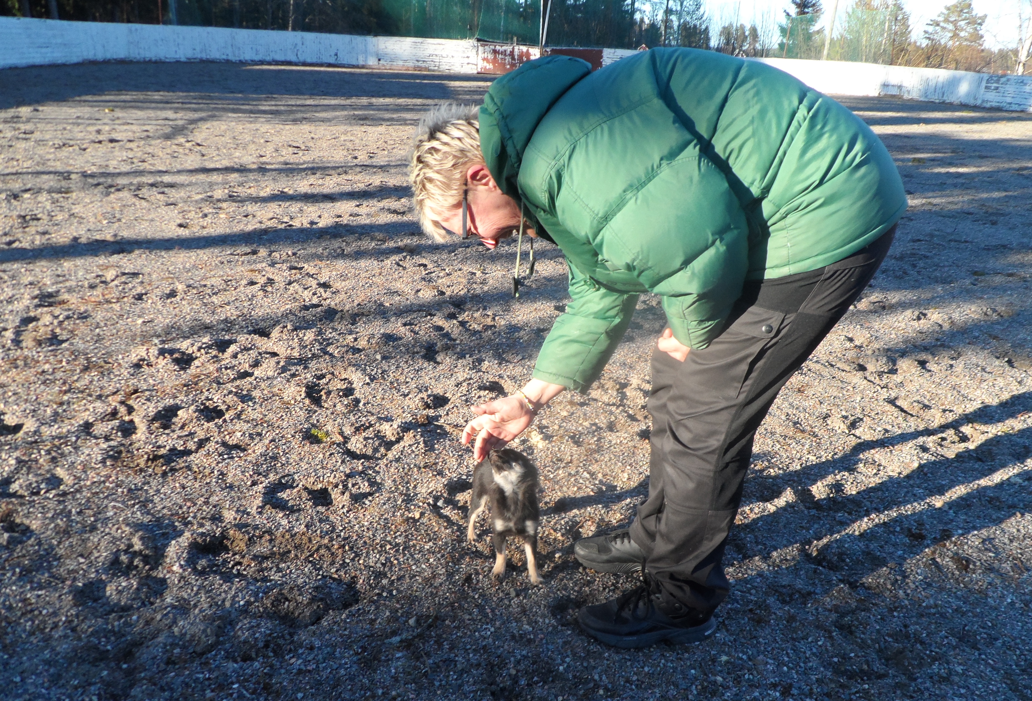 Så Monika fick utrusta sig med korv och köttbullar och ropa in honom gång på gång utan att hålla i selen. Han fick bara hämta en godis och sedan sa hon ”hopp och lek” så var han fri igen. Han skulle känna att när hon ropar är det liksom ”piece of cake”. ”Jag ska bara springa till matte och hämta en korvbit sedan får jag vara fri igen”.