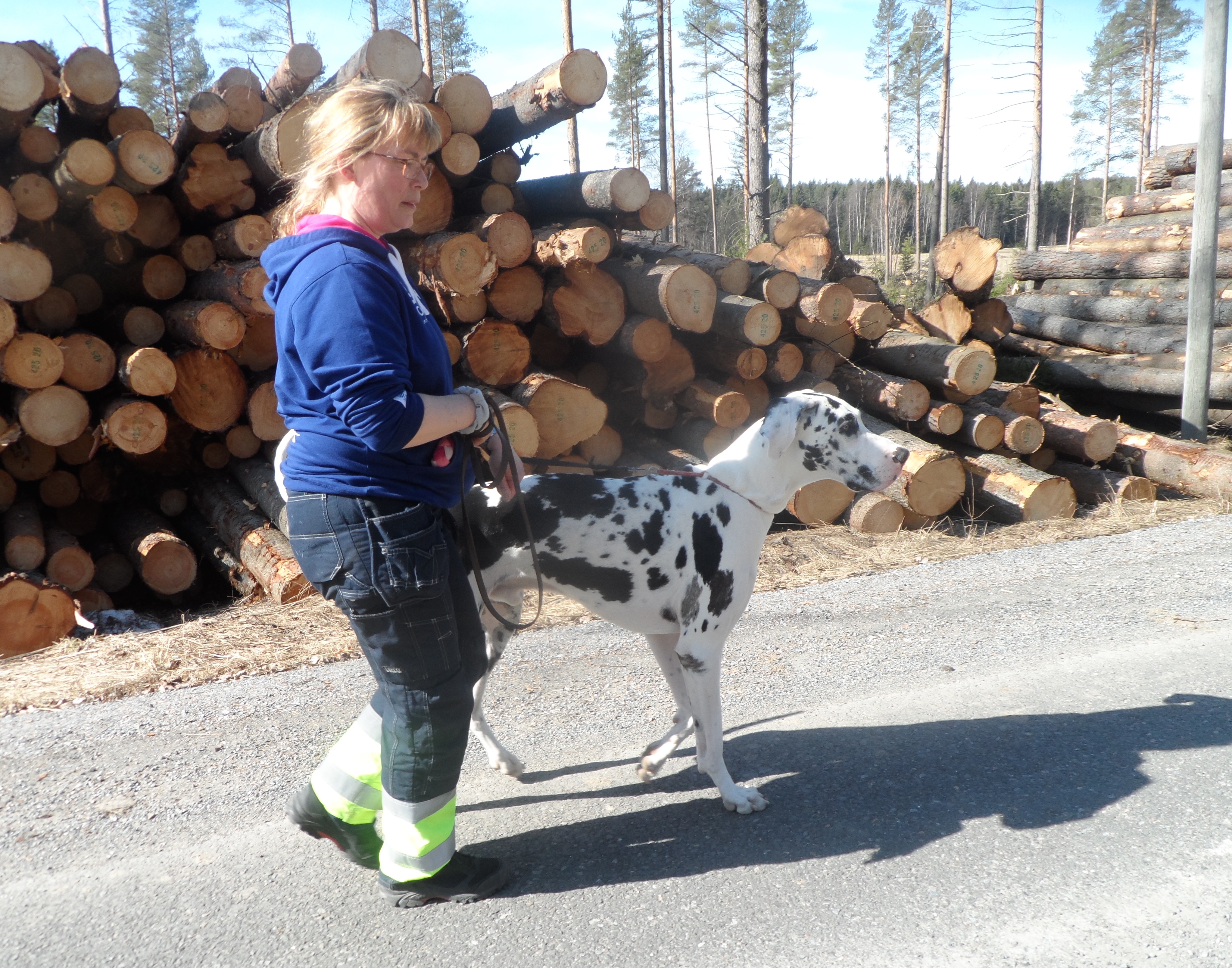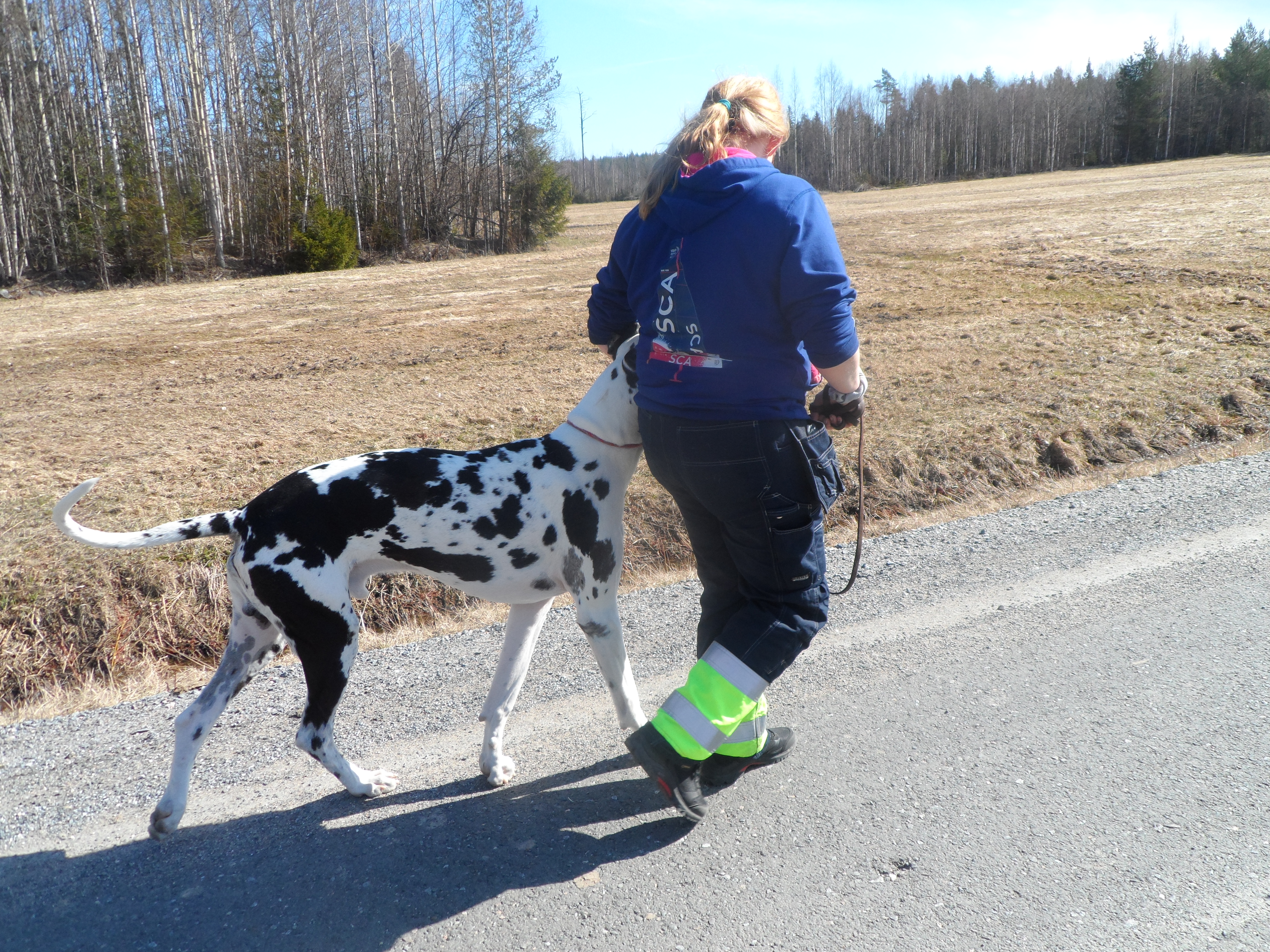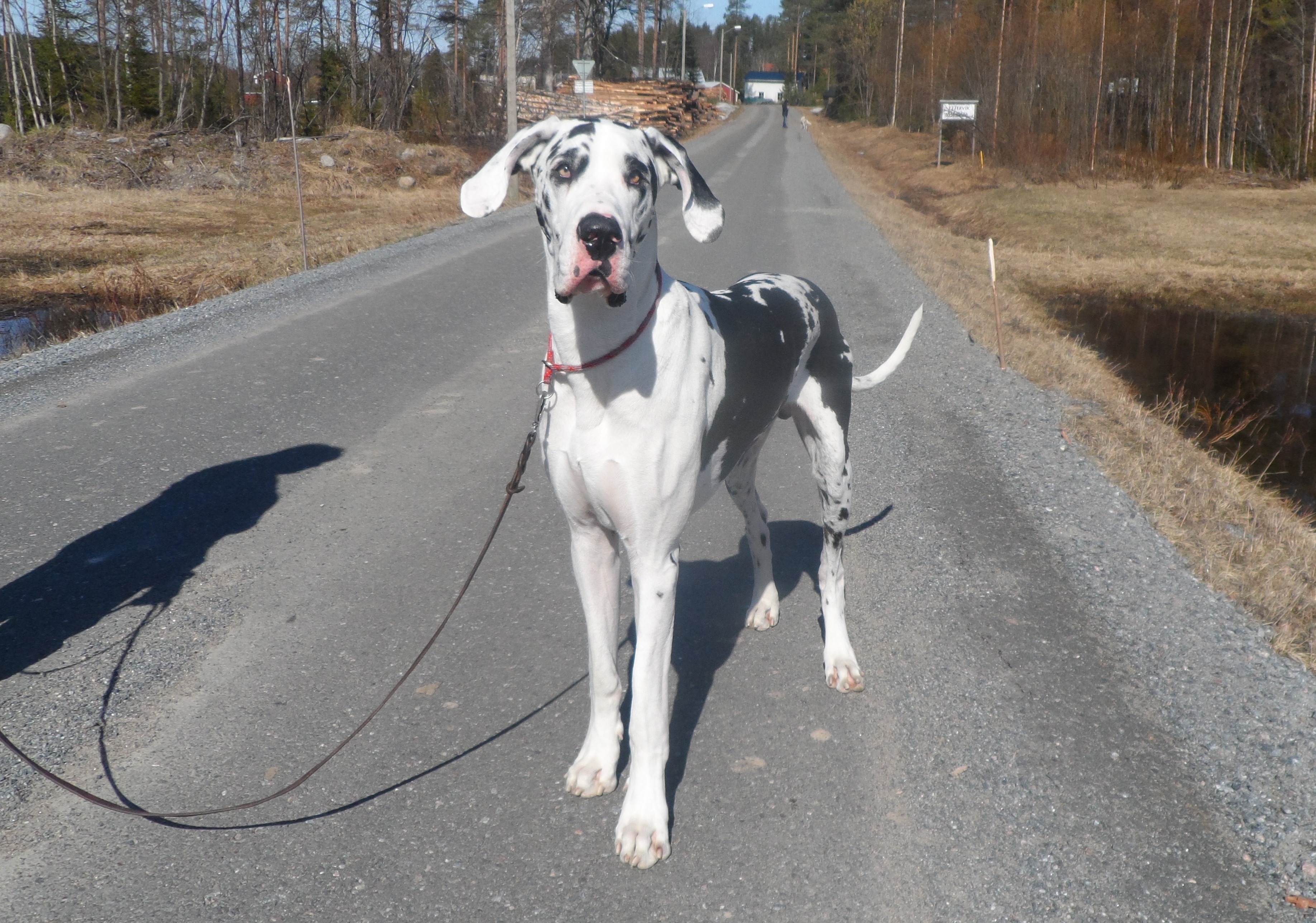 I dag hade jag en helt annan hundägare och hund på besök. Kristina ville träna hundmöten med sin jättehund Sheriffen. Passande namn: det är en harlekinfärgad grand danois. Hon menade att han gjorde utfall med ganska onda tankar mot de hundar han mötte. Och det är ju inte det lättaste att tampas med en envis, tung grand danois. Kristina visade att hon var enormt van, rutinerad och stark nog att hantera dessa krafter, så det var aldrig någon oro för att han skulle kunna dra med henne för att göra ett ovälkommet besök hos den mötande hunden.