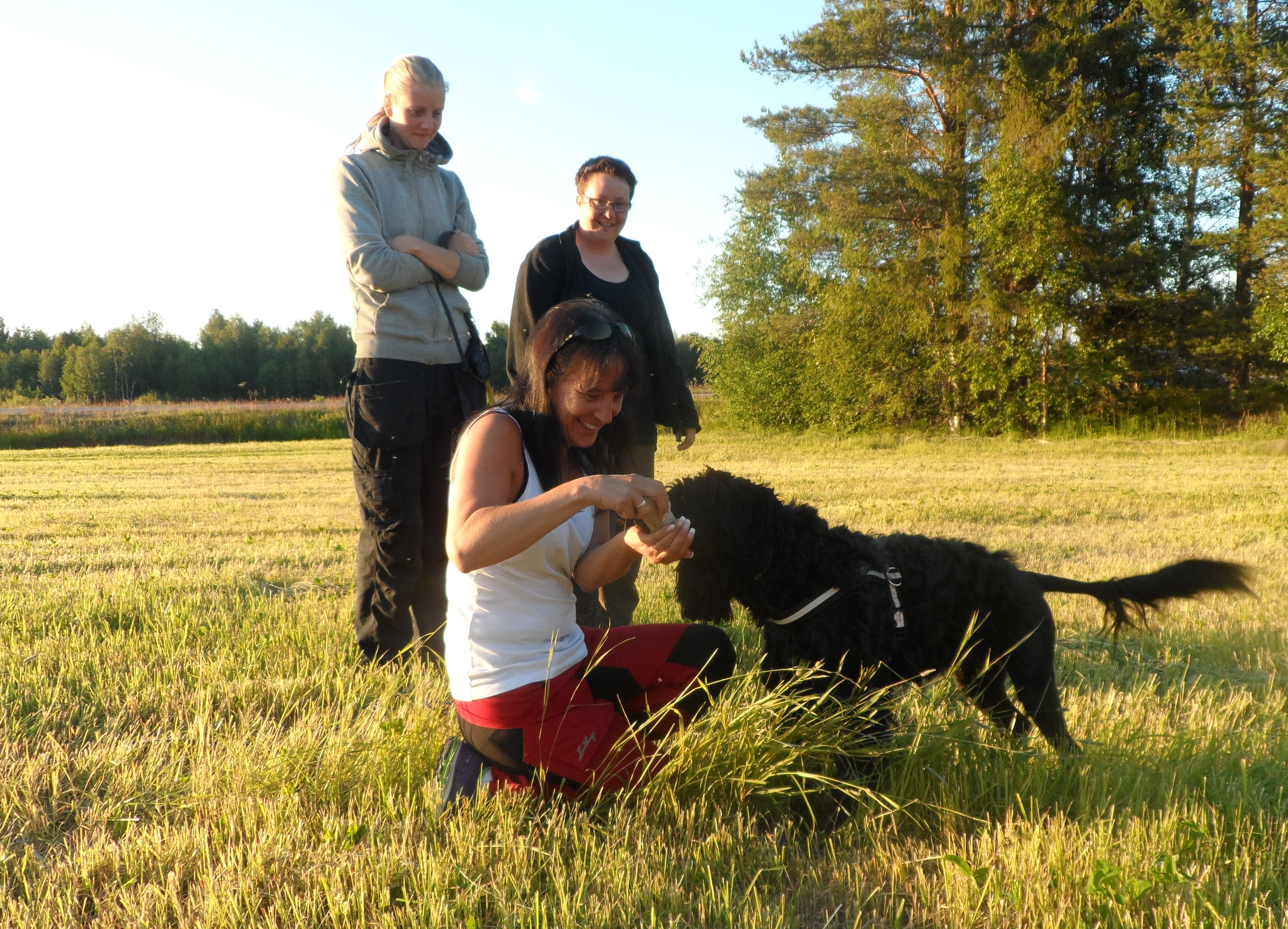 När du lärt valpen att gå upp med framtassarna på pallen kan du börja lära den bakbenskontroll, alltså att den ska flytta bakbenen runt medan frambenen står kvar på pallen. Tidigare när hundägare rekommenderade den här övningen för att få bättre och säkrare position på fotgåendet så tänkte jag att de överdrev. Det kändes så långsökt att hunden skulle bli bättre på att gå fot och hålla sig rätt vid sidan bara av att gå upp och runt på en pall. Men jag har sett STOR effekt på alla hundar där jag testat detta. Så jag rekommenderar det varmt. Du som är riktigt klickernördig kommer att tycka att jag hjälper Skott lite för mycket när han ska flytta bakbenen. Det kan jag hålla med om. Men som bekant finns det flera vägar som bär till Rom och att hjälpa en nyligen klickerintränad hund med lite småtips i början tycker jag inte är hela världen =)