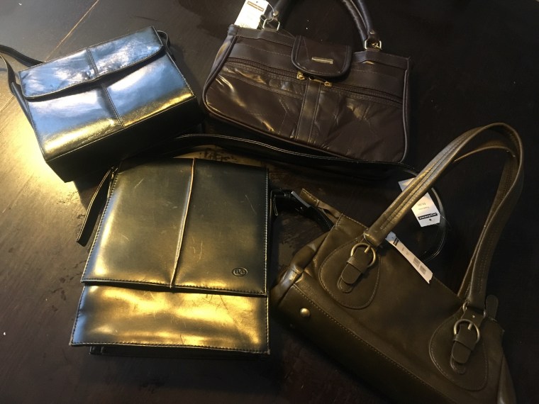 Men nu får det vara nog tramsat med skinn/plastväskor. Nu måste både jag och Hagel lära oss att kolla dem ordentligt. Så häromdagen åkte jag till Myrorna och köpte på mig fyra stycken av den svåra täta typen. 50-75 kr styck.
