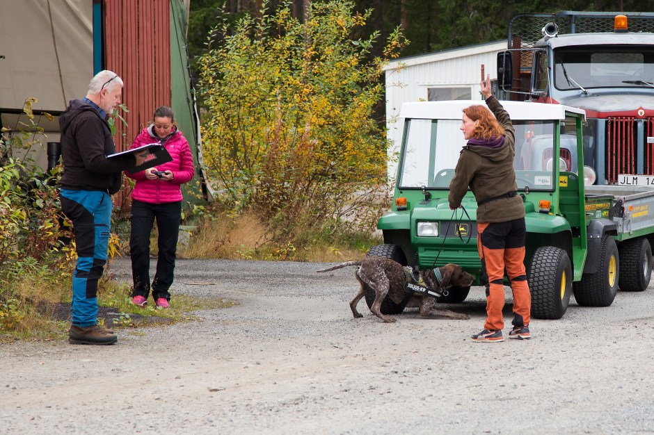 Vi sökte klart på släpen och sedan drog vi till vita Caddyn. Började bak och sökte oss fram mot framdelen. Vid hjulhuset blev Hagel intresserad. Var gömman i däcket? Uppe under skärmen? Bakom nån ”flärd” frampå spoilern? Det var svårt att avgöra. Doften spred ut sig lite varstans. Hagel tyckte definitivt att doften satt uppåt och började klättra i sin utredning. Men inga tassar på bilar löd dagens regel. En gång stoppade han in hela huvudet mellan däcket och skärmen och då tänkte jag säga markering, men skulle domaren fråga igen var så skulle jag ha svårt att svara något exakt. Så jag avvaktade. Försökte be honom söka av igen, lugnt och fint, men Hagel blev bara mer ivrig/stressad och började gå högt med tassarna igen.