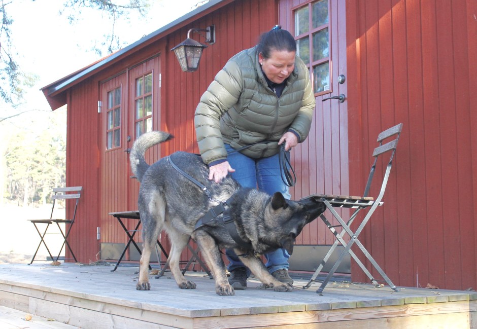 På utomhussöket var min plan att gå genom startkonerna, sedan till vänster, söka av räcket, väggen, dörrarna och sedan vidare mot däckhögen och utemöblerna med grillen som punkt längst bort. Det funkade ganska bra. Hagel hittade snabbt en gömma i däcken, ovanifrån, sedan sökte vi oss vidare och hittade nästa i konstrottingstolen närmast grillen. Hagel stod på sitsen och markerade nedåt.