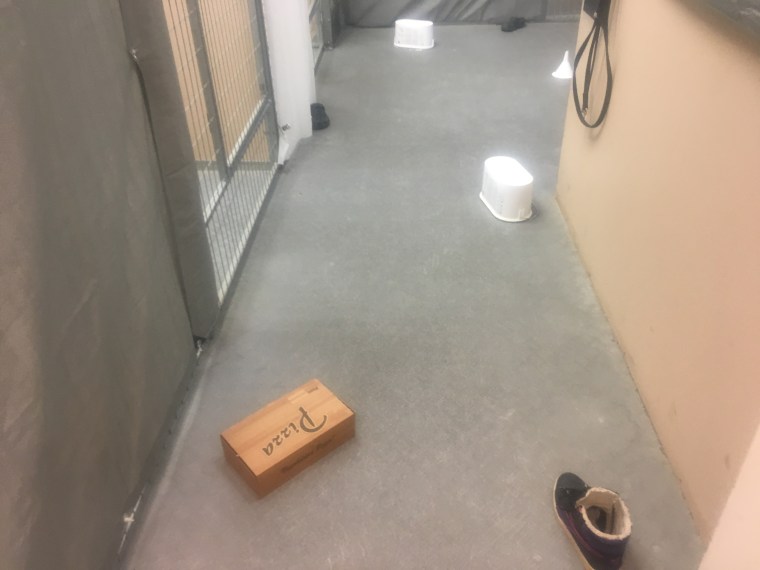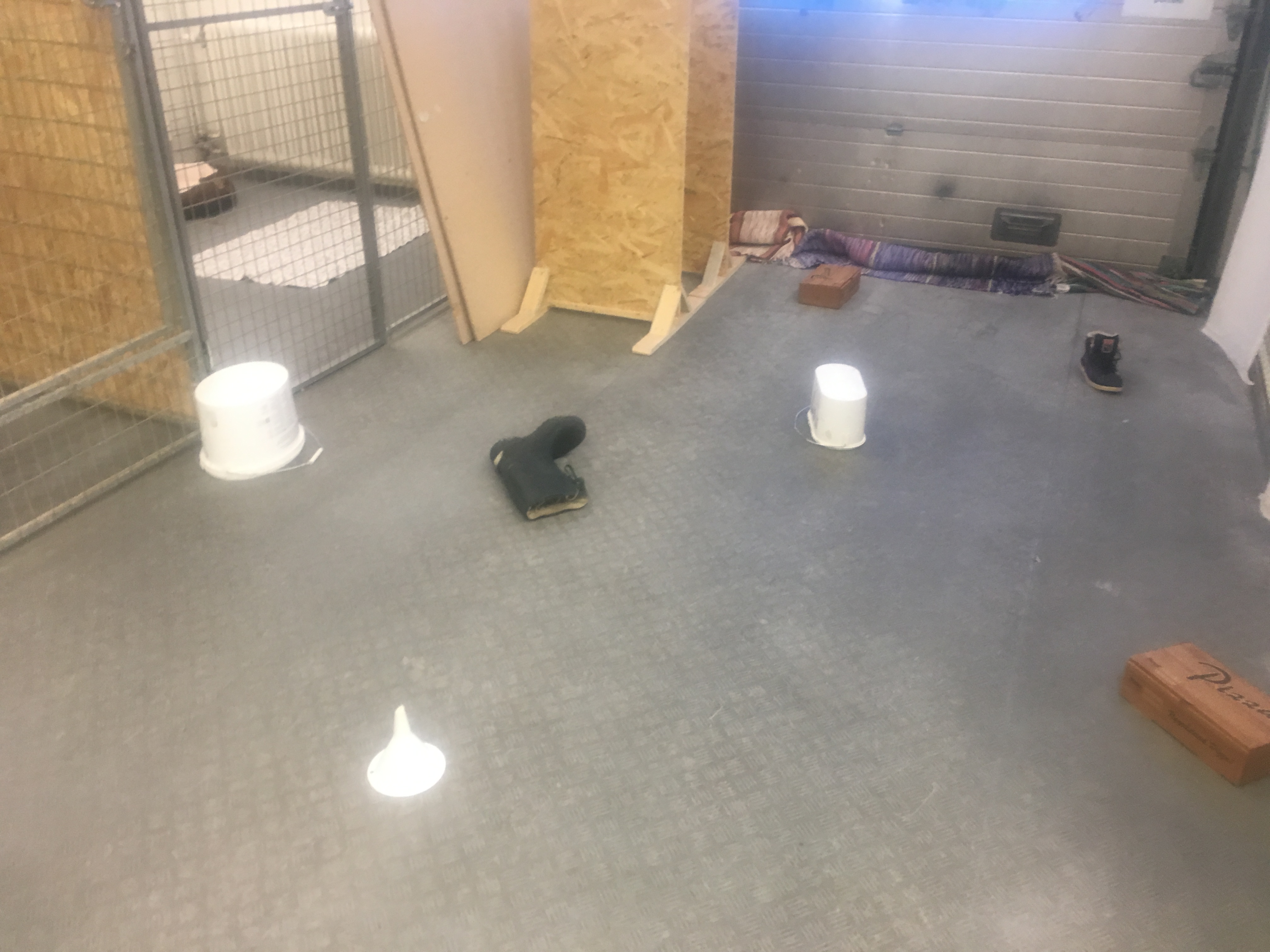 Behållarsöket var stort. Vi hade två minuter på oss. Behållarna var placerade på golvet i ett hunddagis. Vilka störningsdofter! Hagel är ändå oftast duktig på att fokusera, och det började bra. Första rummet sökte han fint och hittade första gömman i en låda. Sedan sökte vi oss vidare i en liten gång och kom in i andra rummet. Där stannade Hagel och bara sög in doften på en av hundkojorna. Nåja, han går ganska lätt att bryta och han sökte vidare på några behållare. Snart stannade han och sniffade på en munkorg. Intressant tyckte han. Inte jag.