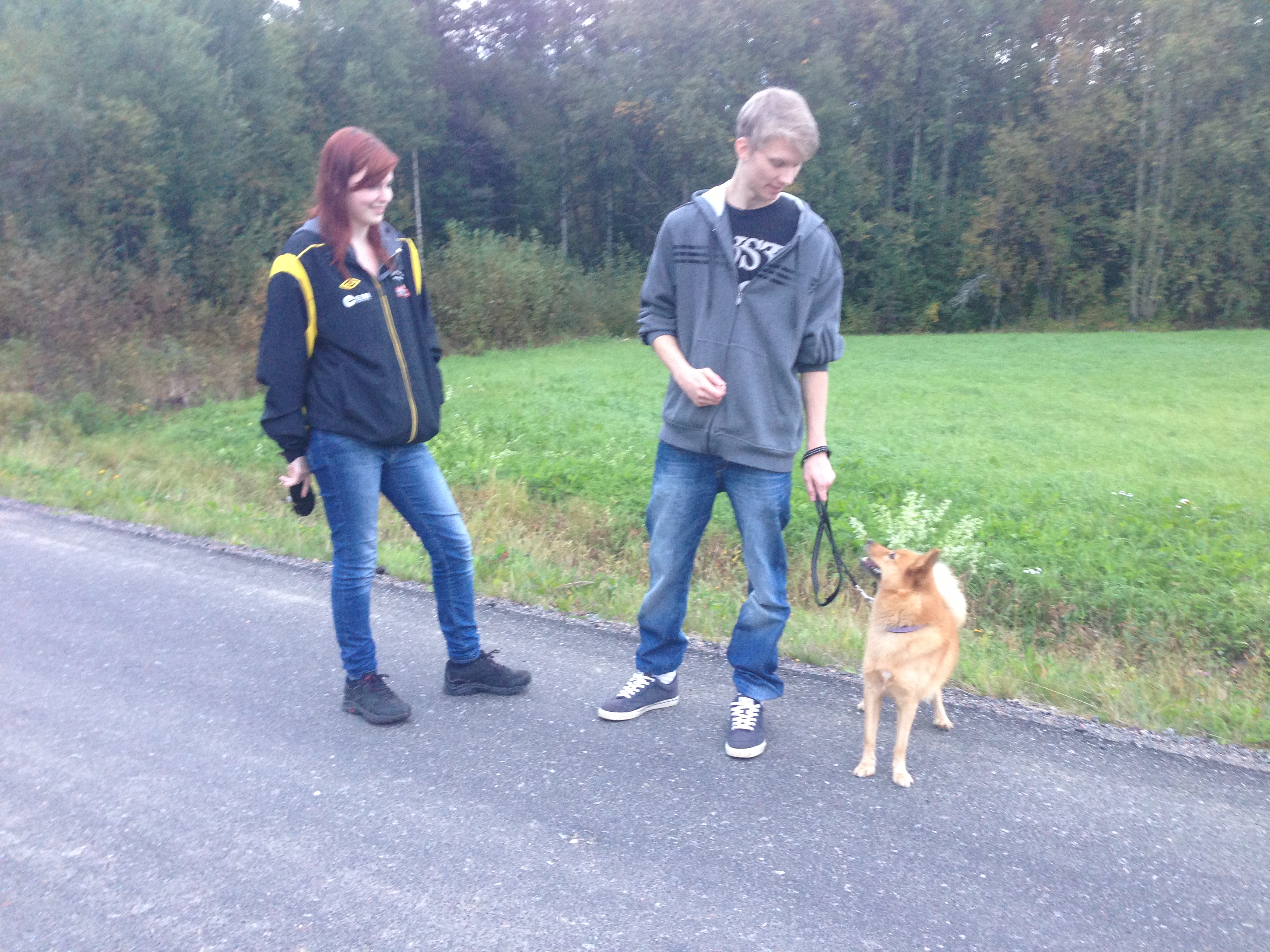 Steg 1. Börja med att träna hunden på att gå fot. Alltså att den går hyfsat prydligt på din vänstra sida utan att streta och dra och utan att titta på allt annat. Den ska huvudsakligen ha fokus på dig. Det tränar du genom att ha smaskiga godisar, gärna på korv- och köttbullenivå så att hunden blir rejält motiverad och tycker att det känns värt. Tycker du att det blir kladdigt i fickan så skaffar du en belöningsväska. Ha cirka fem godisar i vänster hand, det blir enklare än höger hand eftersom du kommer att slippa vrida dig så mycket då, och visar din knutna näve framför hundens nos. Sedan drar du upp handen till bröstkorgen och testar att gå några steg. Om hunden hänger med bra, och gärna tittar förväntansfullt på dig, så ger du snabbt en godis samtidigt som du säger ”bra”. Belöna redan efter två–tre steg. Eftersom du har några godisar kvar så gör du om proceduren. Fresta hunden med godisnäven framför nosen, dra upp handen till bröstkorgen, och gå några steg. Det gör inget om hunden hoppar av förväntan just nu, huvudsaken att den fokuserar på dig och vill hänga med. Längre fram kan du sätta som kriterie att godisen inte utdelas när hunden hoppar, utan bara när den går med tassarna i marken. Det kommer snabbt hunden att lära sig och forma sitt beteende. Men just nu är vi nöjd om hunden hänger med, är glad och fokuserad.