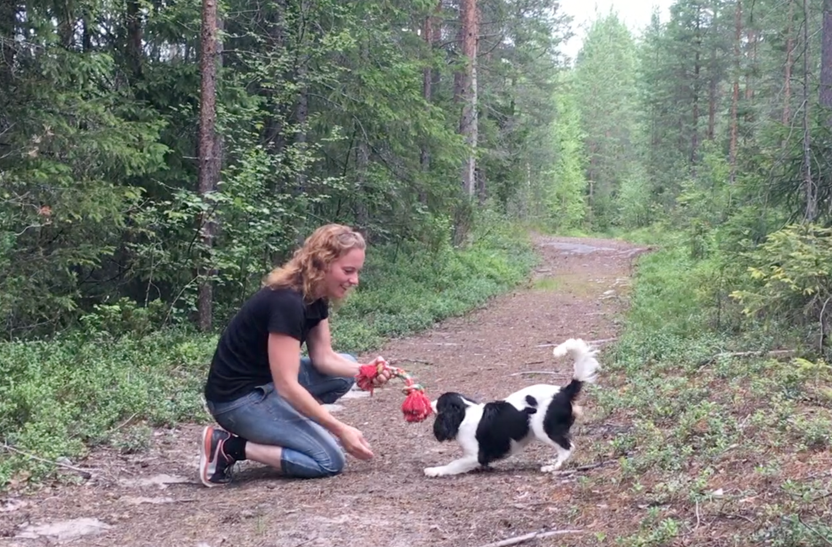 Efter det blir det Ramboträning, det vill säga tuff men kul miljöträning. Vi kommer att gå i olika trappor, balansera på brädor, gå på plåt, klättra på saker. Kom ihåg att inte pjåska och tycka synd om hunden om den verkar orolig i någon situation. Det gör bara i så fall att hunden får vatten på sin kvarn, den tänker att då ÄR det verkligen något att vara rädd för om matte/husse pjåskar så där. Istället ska du agera hurtfriskt, tryggt och peppande. Belöna högljutt och entusiastiskt varje framgång som hunden gör.