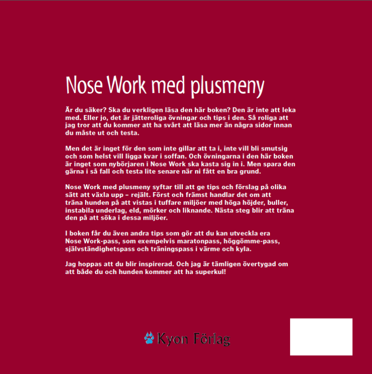 ”En mycket lättläst bok där Susanne delar med sig av många bra tips hur man kan träna sin hund till en miljöstark och glad Nose workstjärna. Susanne mixar sin erfarenhet från räddning och Nose work på ett mycket inspirerande sätt. En bok för dig som vill komma vidare med din träning.” Barbro Ekenberg, Motala.