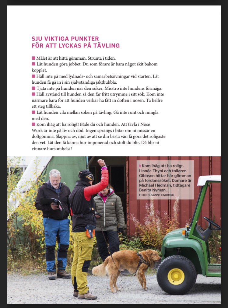 Jag har skrivit en ny Nose Work-bok. Den har precis skickats på tryck. Det blir en uppföljare till den tidigare boken ”Nose Work – det bästa du kan göra med din hund” som jag skrev med domarna Adam Hübinette och Martin Johnson.