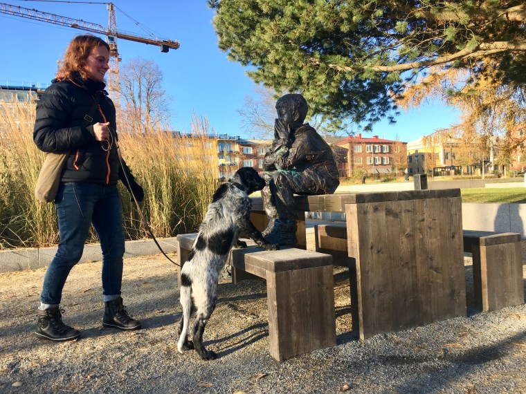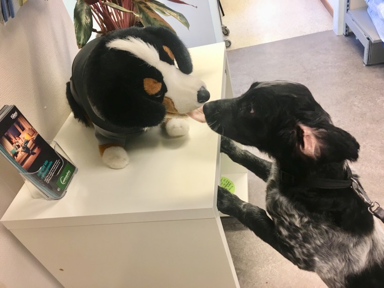 En annan övning som är toppen för att komma igång med klickerträning på en valp är att träna den på att gå upp med framtassarna på en pall. Det är något konkret som valpen ser och förstår. Det här är absolut första gången vi testar det och jag blir glatt överraskad över hur klickersmart Skott har blivit.