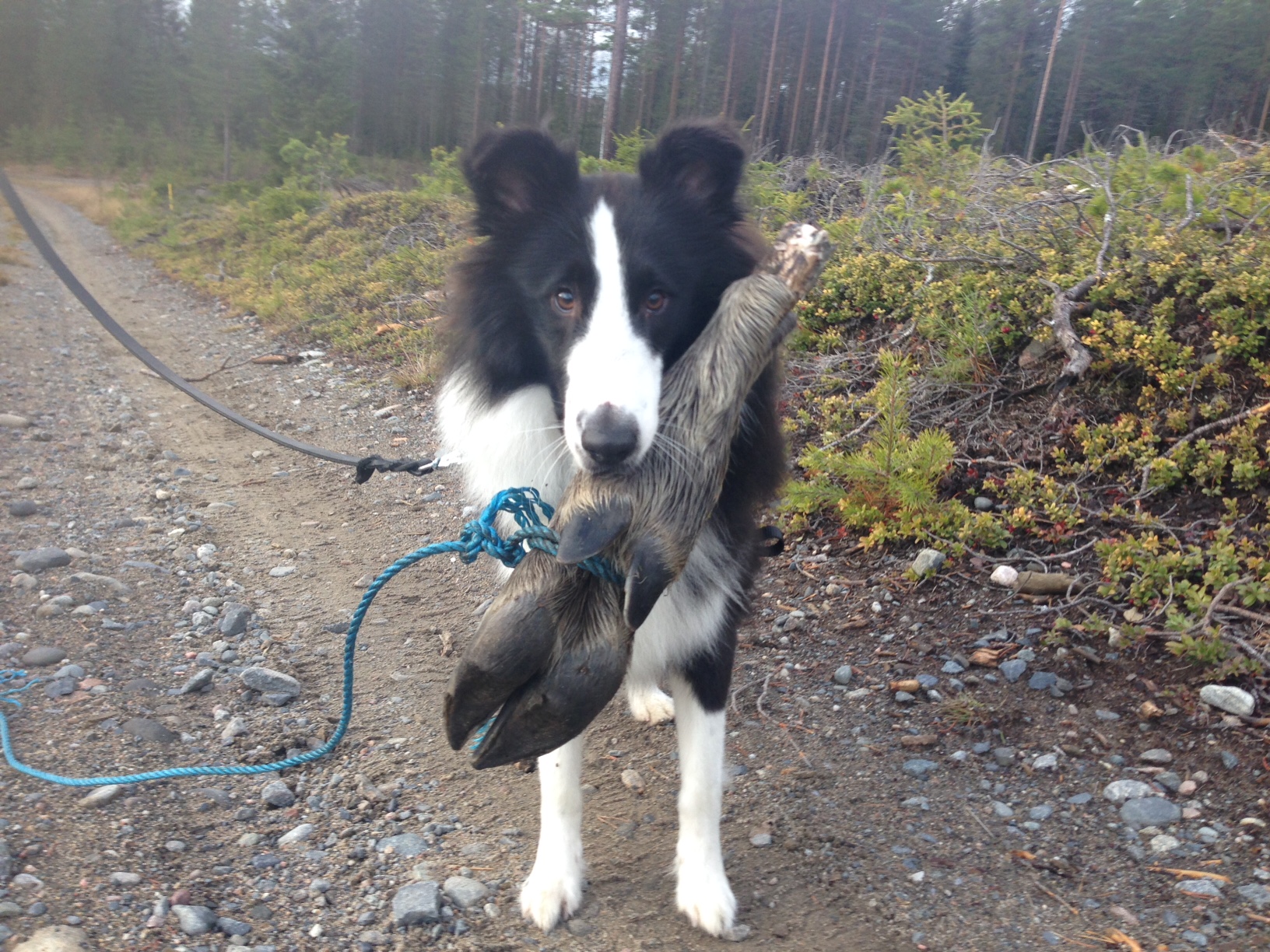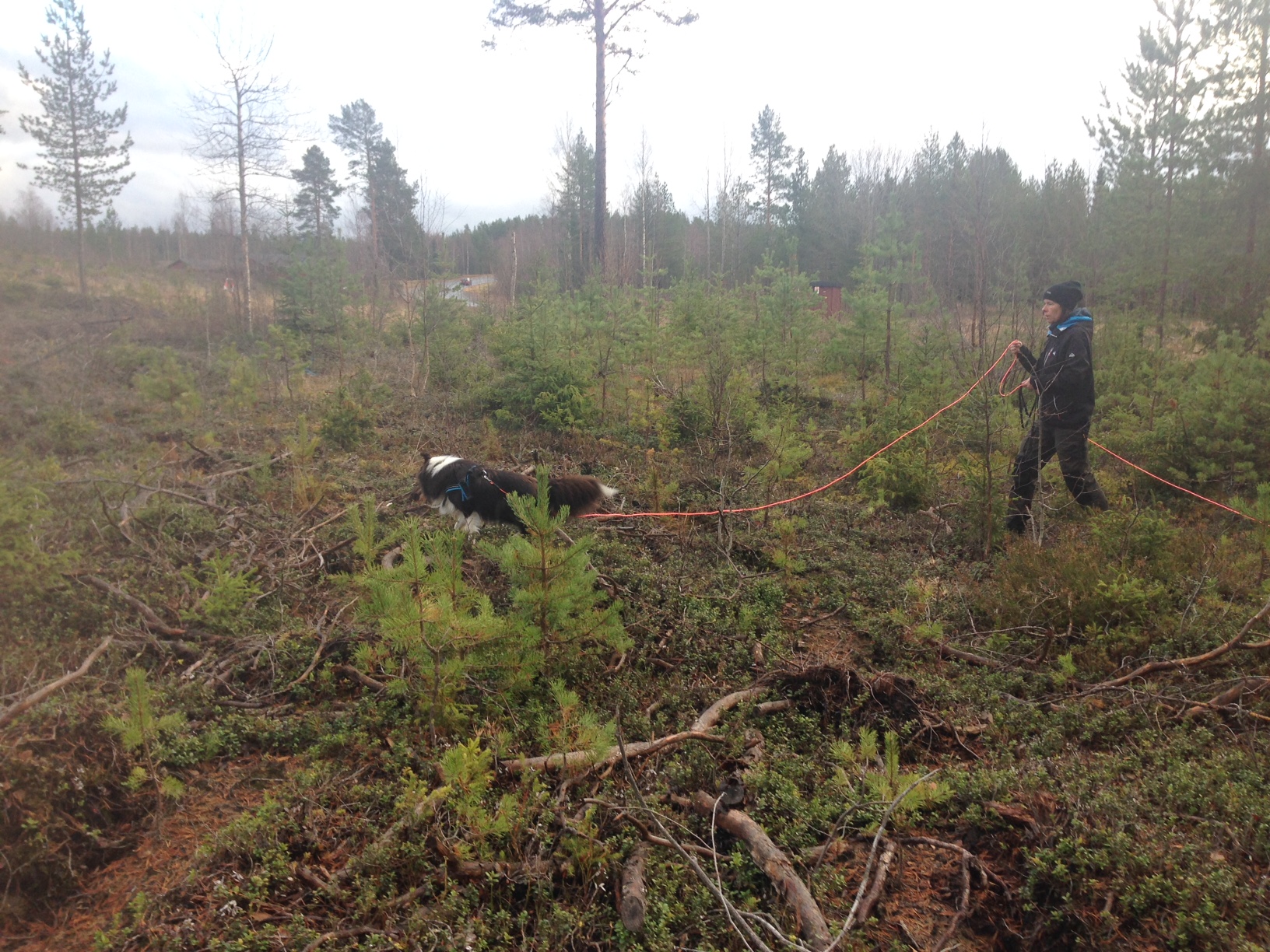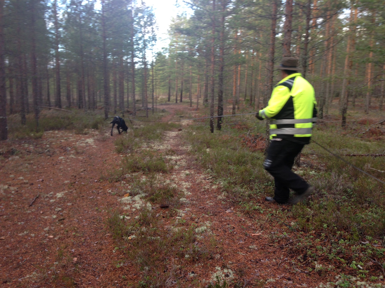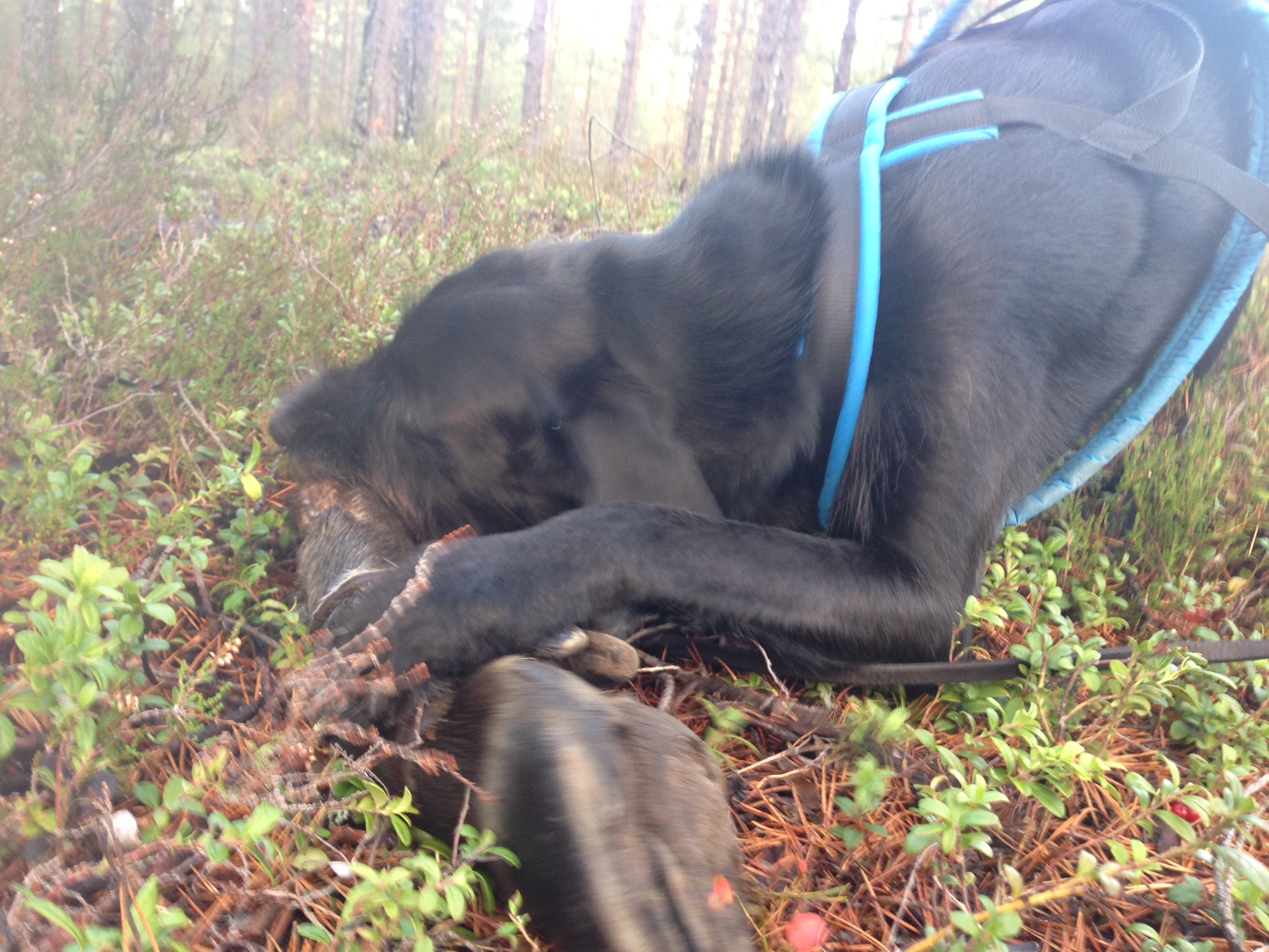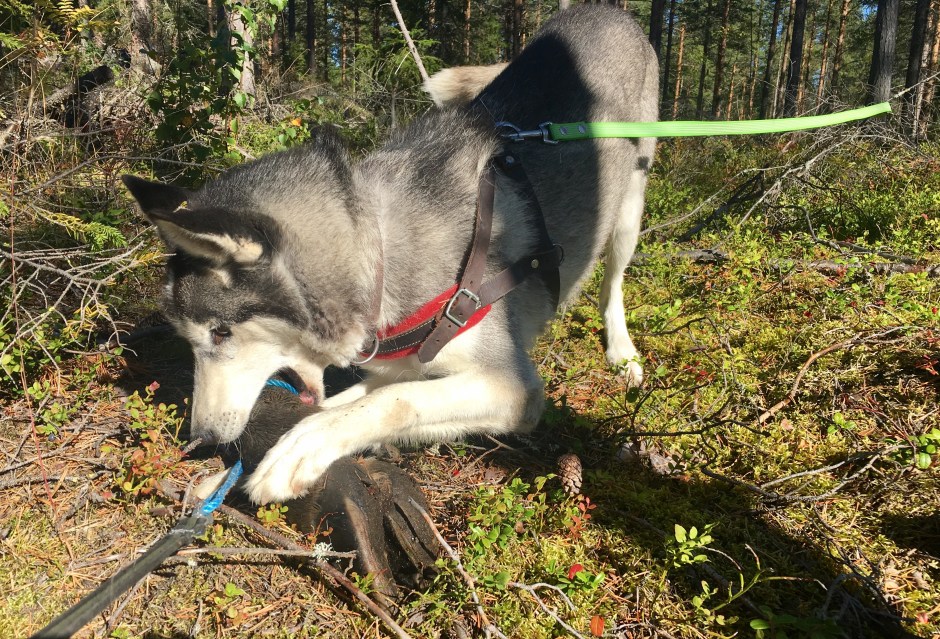Vante fick börja. Han är idag elva år och vad jag kan minnas har han aldrig fått testa på ett viltspår. Han var full av förväntan fastän han inte hade en aning om vad som väntade. Jag gick med honom i koppel till stället där jag hade börjat dra klöven, selade på honom och satte på spårlina. Sedan visade jag med en handrörelse ned mot där klöven hade dunsat i marken första gången. Han sniffade lite avslappnat. Sedan kände han den där spännande doften och gick genast igång. Med full koncentration och fokus följde han spåret genom skogen. Det var en fröjd att se. Sedan kom han fram till platsen där jag hade knutit fast klöven i ett träd. Han luktade nyfiket. Jag knöt loss klöven och drog lite retsamt. Då vaknade vilddjuret i honom! Häftigt att se. Vilken lycka att få gnaga på detta ben. Vante var så lycklig. Han till och med rullade sig på benet för att verkligen gnugga in doften. Sedan bar han hem det med en mallig knyck på nacken.