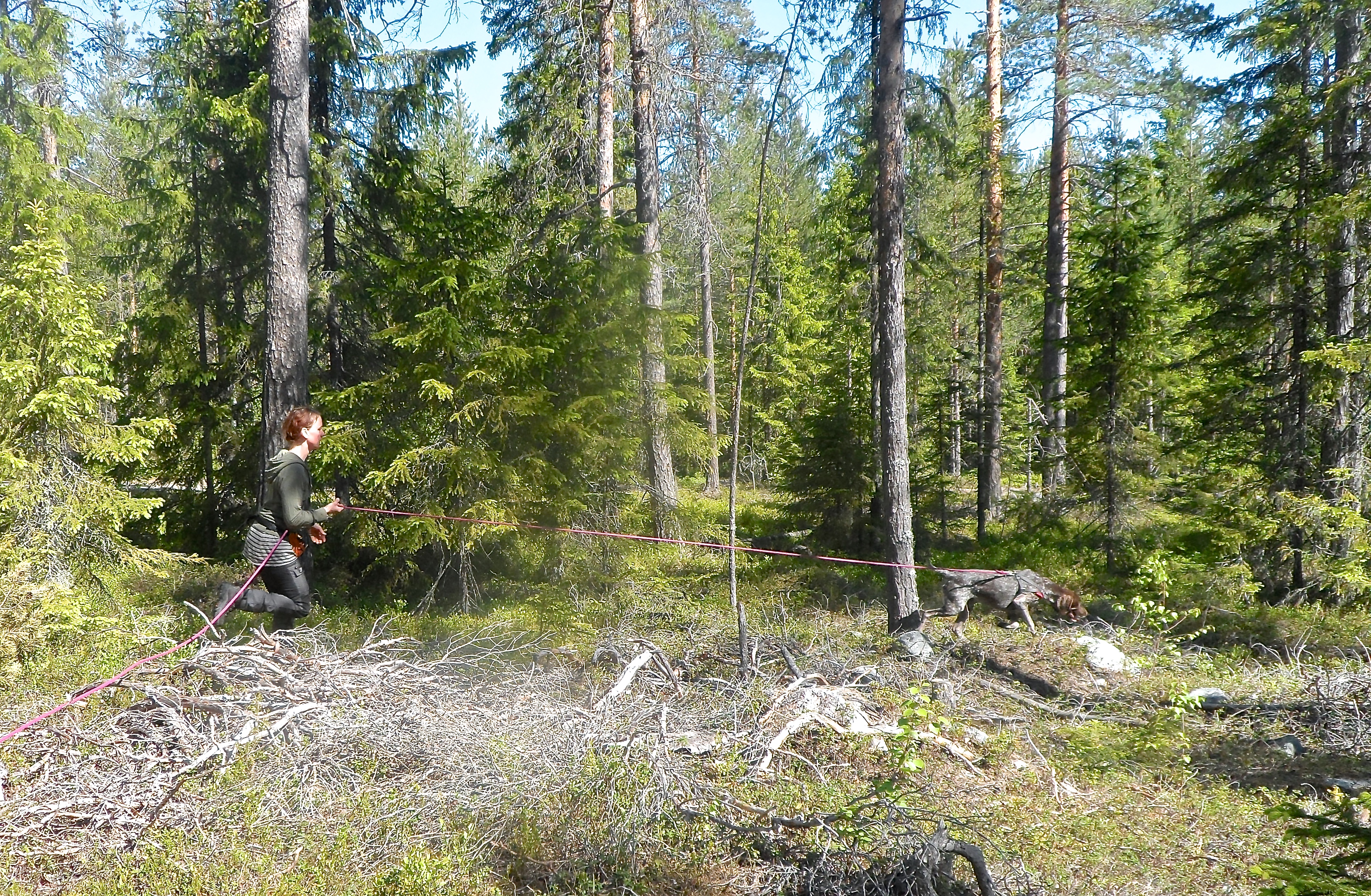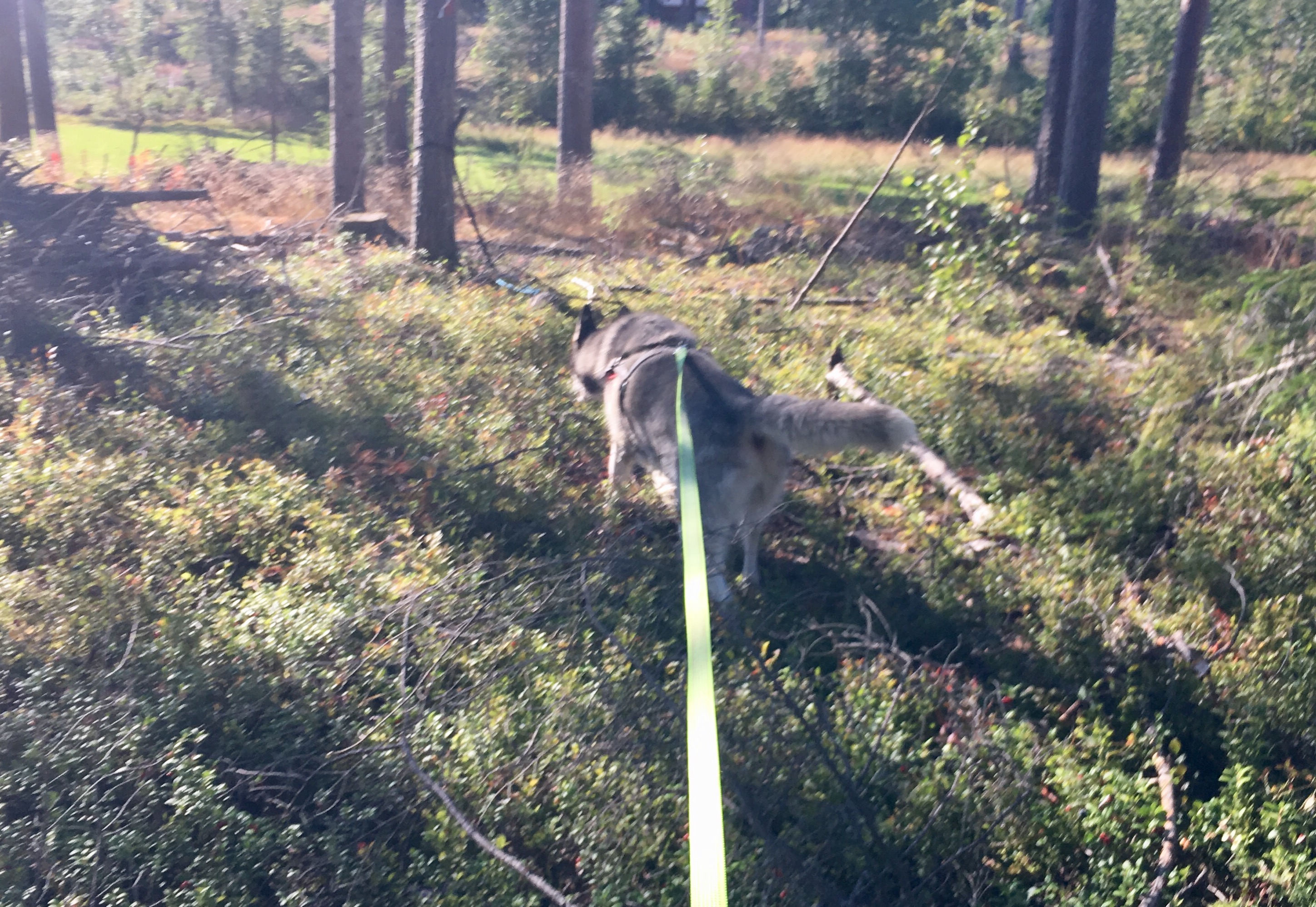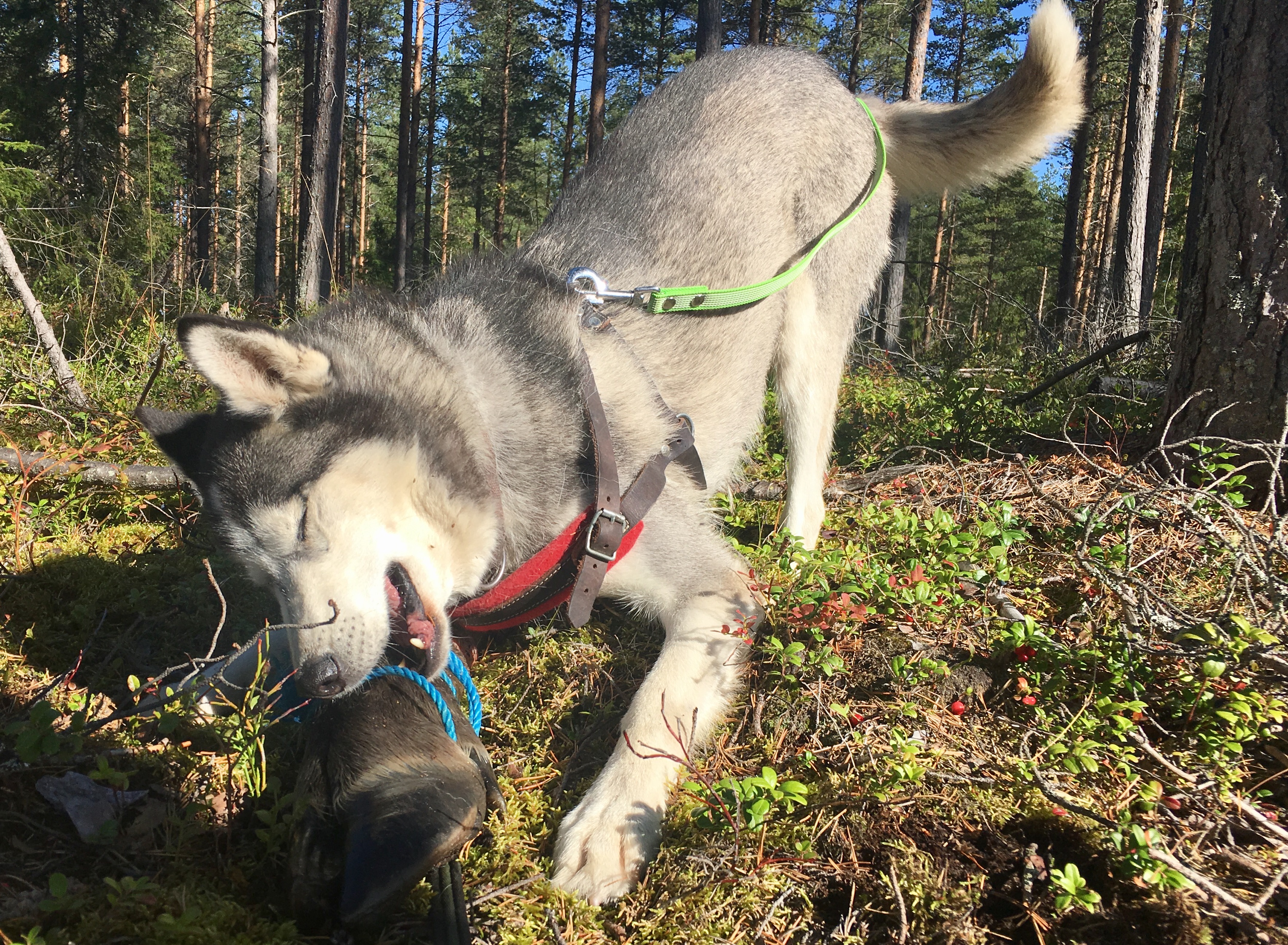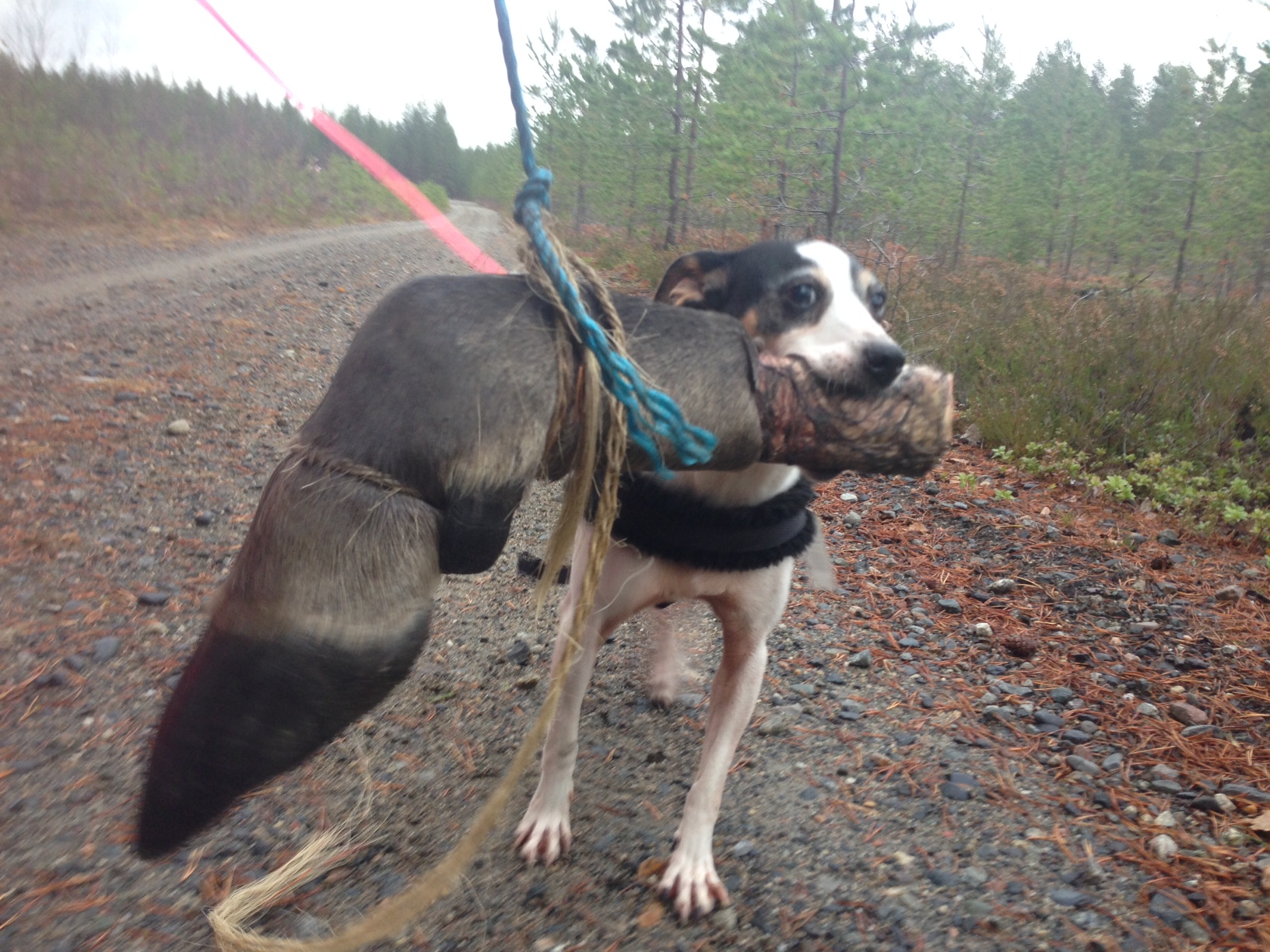 Vante fick börja. Han är idag elva år och vad jag kan minnas har han aldrig fått testa på ett viltspår. Han var full av förväntan fastän han inte hade en aning om vad som väntade. Jag gick med honom i koppel till stället där jag hade börjat dra klöven, selade på honom och satte på spårlina. Sedan visade jag med en handrörelse ned mot där klöven hade dunsat i marken första gången. Han sniffade lite avslappnat. Sedan kände han den där spännande doften och gick genast igång. Med full koncentration och fokus följde han spåret genom skogen. Det var en fröjd att se. Sedan kom han fram till platsen där jag hade knutit fast klöven i ett träd. Han luktade nyfiket. Jag knöt loss klöven och drog lite retsamt. Då vaknade vilddjuret i honom! Häftigt att se. Vilken lycka att få gnaga på detta ben. Vante var så lycklig. Han till och med rullade sig på benet för att verkligen gnugga in doften. Sedan bar han hem det med en mallig knyck på nacken.