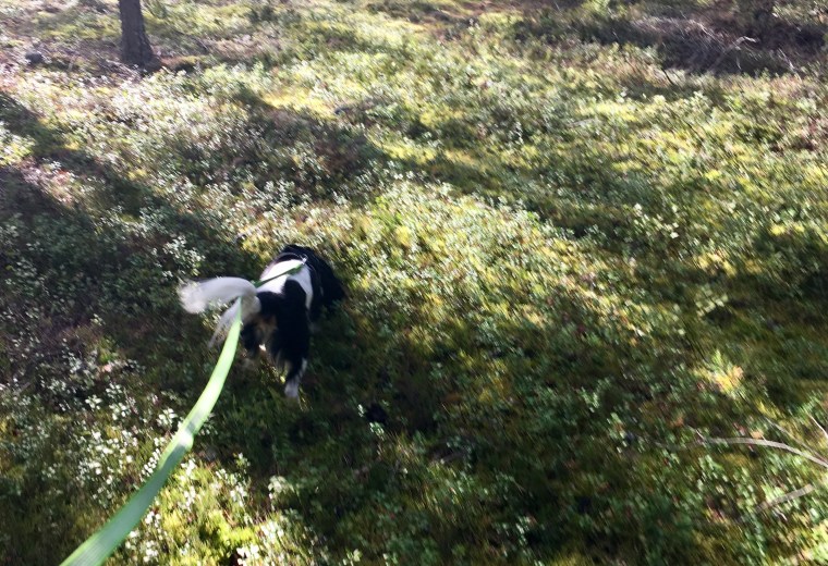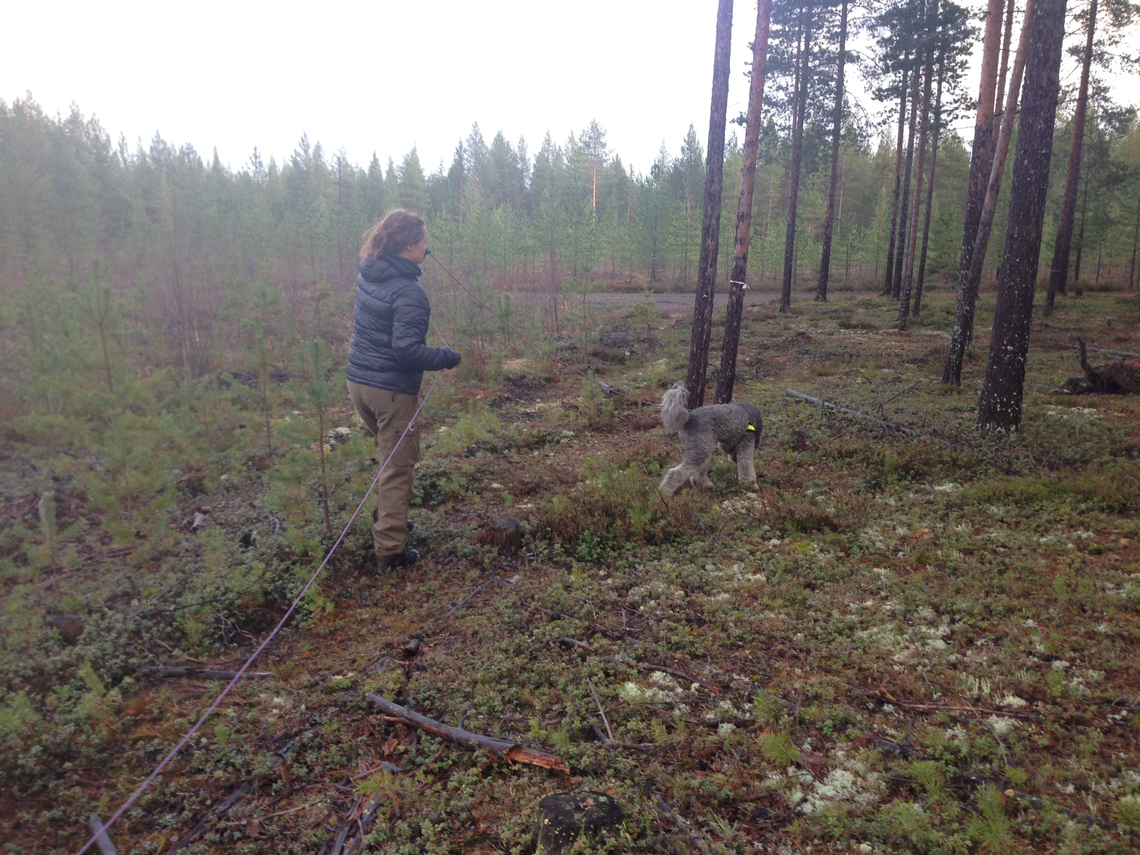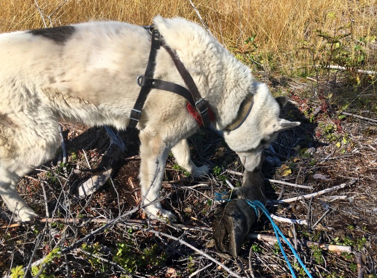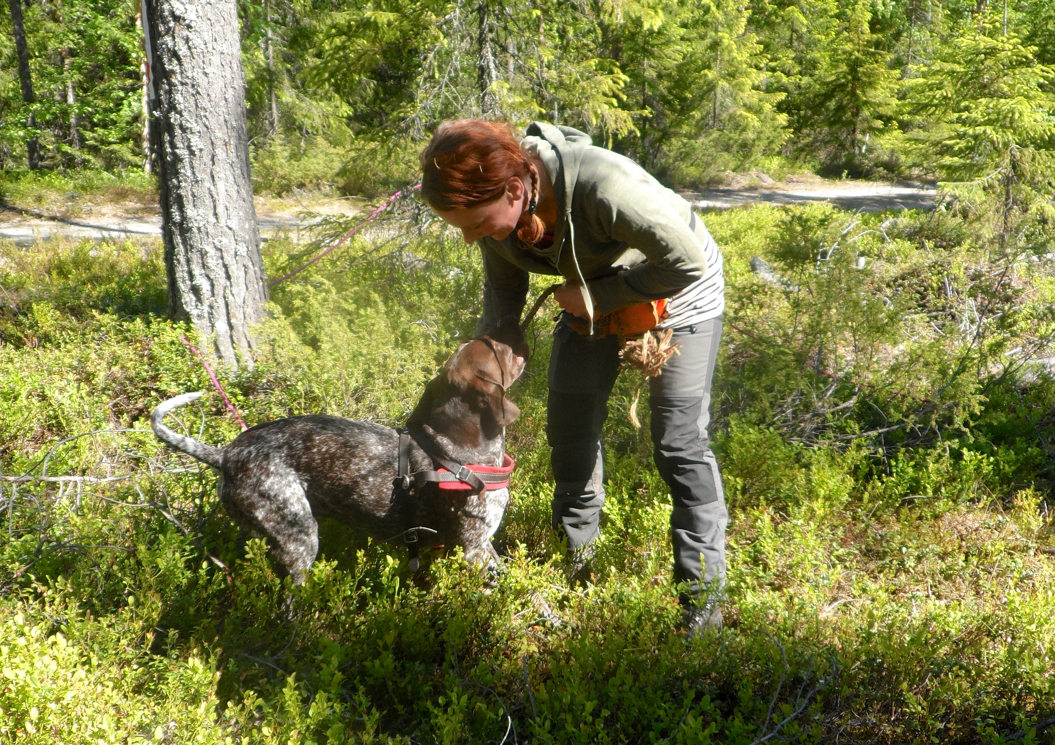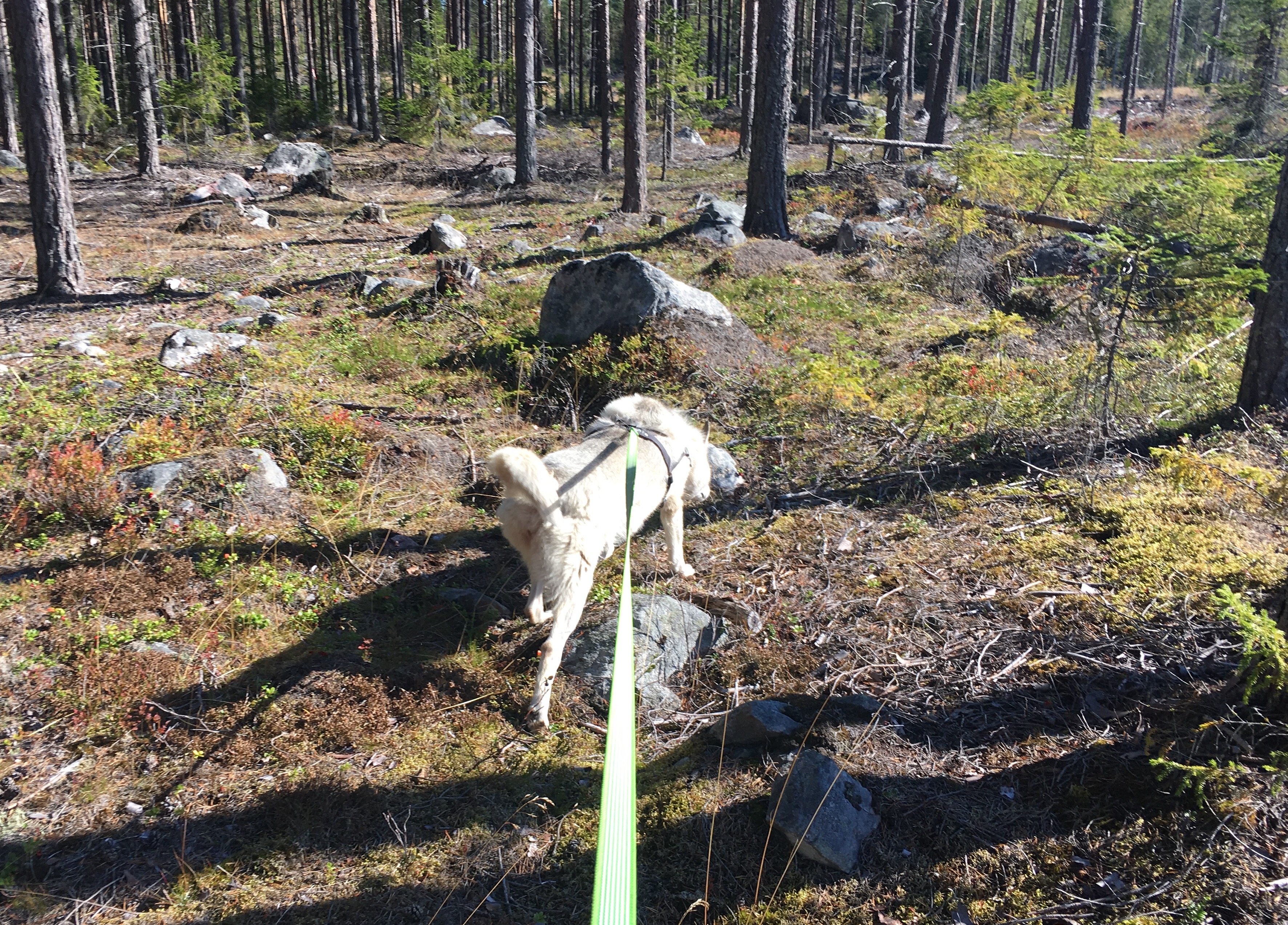 Vante fick börja. Han är idag elva år och vad jag kan minnas har han aldrig fått testa på ett viltspår. Han var full av förväntan fastän han inte hade en aning om vad som väntade. Jag gick med honom i koppel till stället där jag hade börjat dra klöven, selade på honom och satte på spårlina. Sedan visade jag med en handrörelse ned mot där klöven hade dunsat i marken första gången. Han sniffade lite avslappnat. Sedan kände han den där spännande doften och gick genast igång. Med full koncentration och fokus följde han spåret genom skogen. Det var en fröjd att se. Sedan kom han fram till platsen där jag hade knutit fast klöven i ett träd. Han luktade nyfiket. Jag knöt loss klöven och drog lite retsamt. Då vaknade vilddjuret i honom! Häftigt att se. Vilken lycka att få gnaga på detta ben. Vante var så lycklig. Han till och med rullade sig på benet för att verkligen gnugga in doften. Sedan bar han hem det med en mallig knyck på nacken.