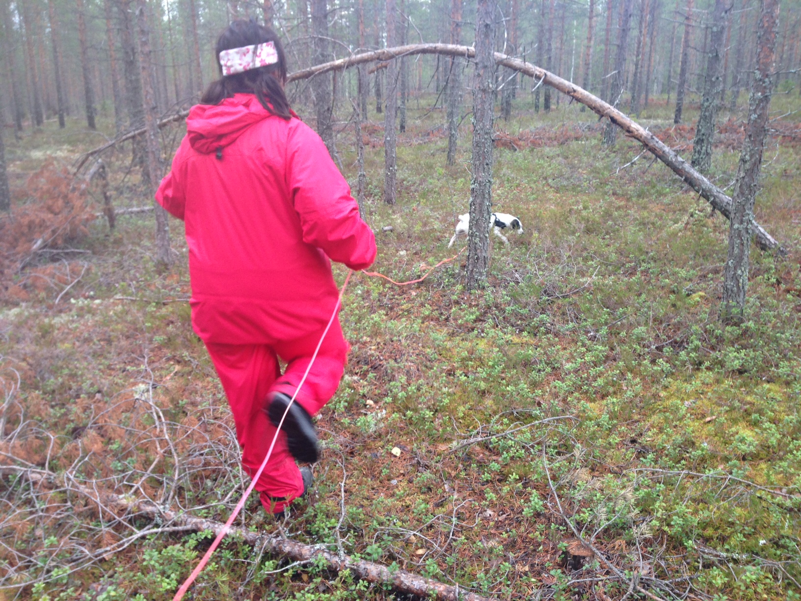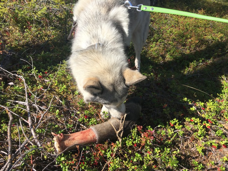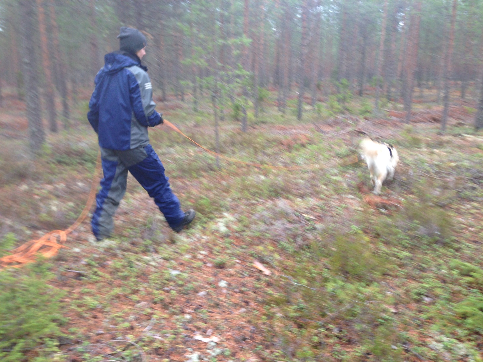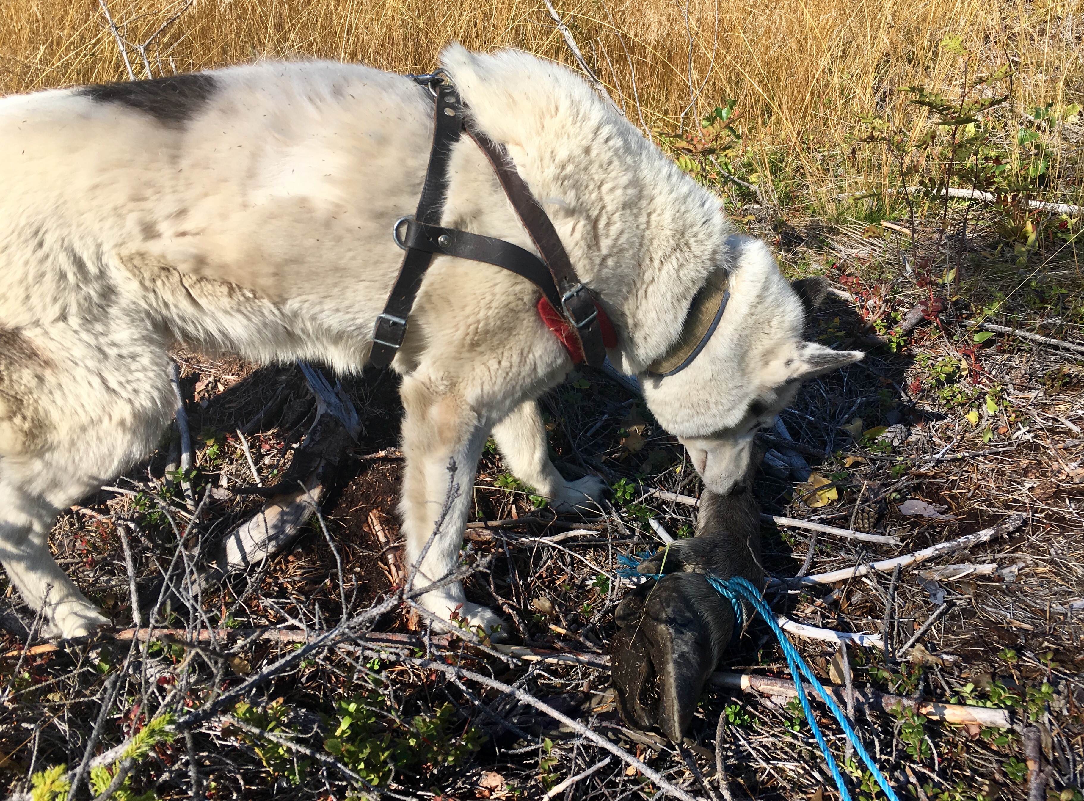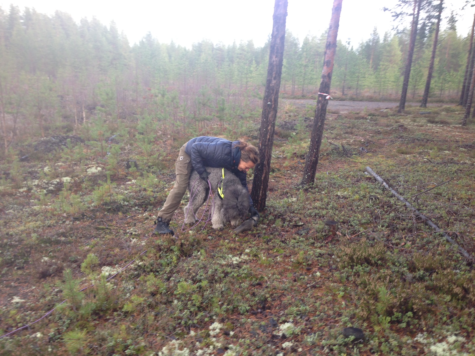 Vante fick börja. Han är idag elva år och vad jag kan minnas har han aldrig fått testa på ett viltspår. Han var full av förväntan fastän han inte hade en aning om vad som väntade. Jag gick med honom i koppel till stället där jag hade börjat dra klöven, selade på honom och satte på spårlina. Sedan visade jag med en handrörelse ned mot där klöven hade dunsat i marken första gången. Han sniffade lite avslappnat. Sedan kände han den där spännande doften och gick genast igång. Med full koncentration och fokus följde han spåret genom skogen. Det var en fröjd att se. Sedan kom han fram till platsen där jag hade knutit fast klöven i ett träd. Han luktade nyfiket. Jag knöt loss klöven och drog lite retsamt. Då vaknade vilddjuret i honom! Häftigt att se. Vilken lycka att få gnaga på detta ben. Vante var så lycklig. Han till och med rullade sig på benet för att verkligen gnugga in doften. Sedan bar han hem det med en mallig knyck på nacken.