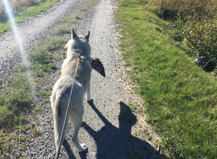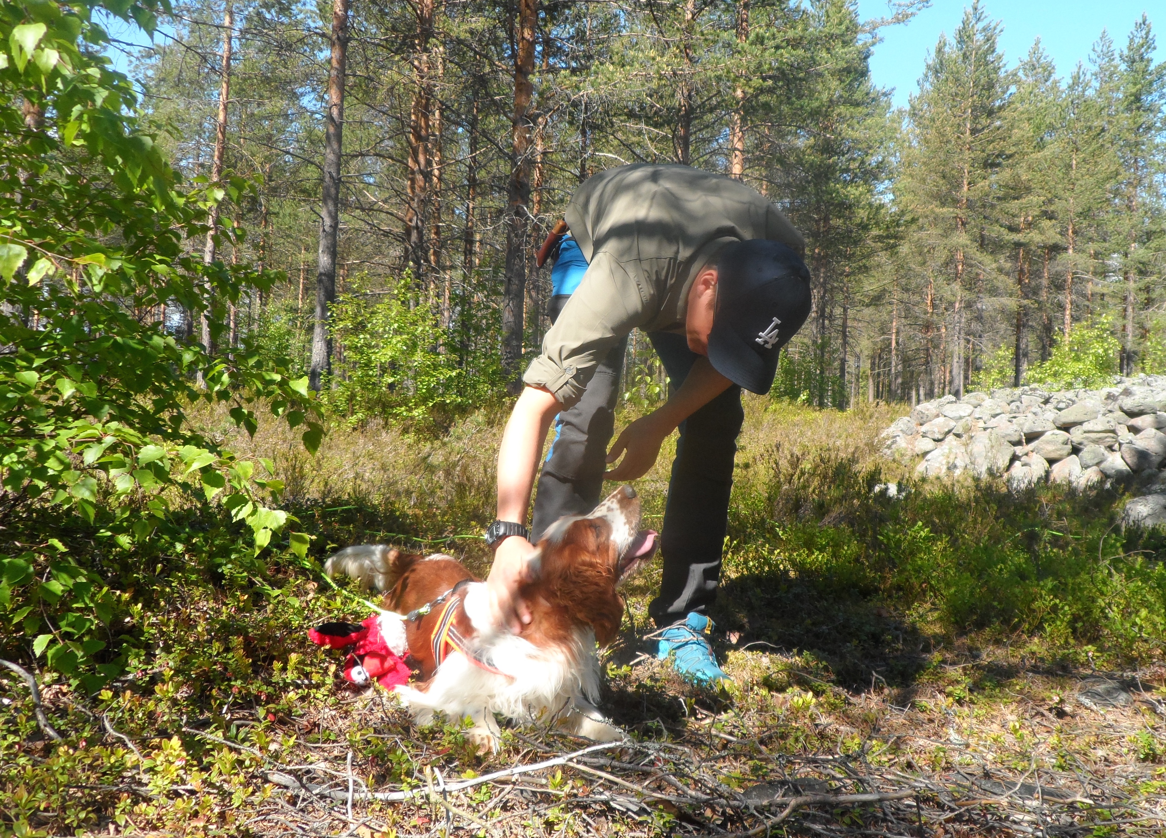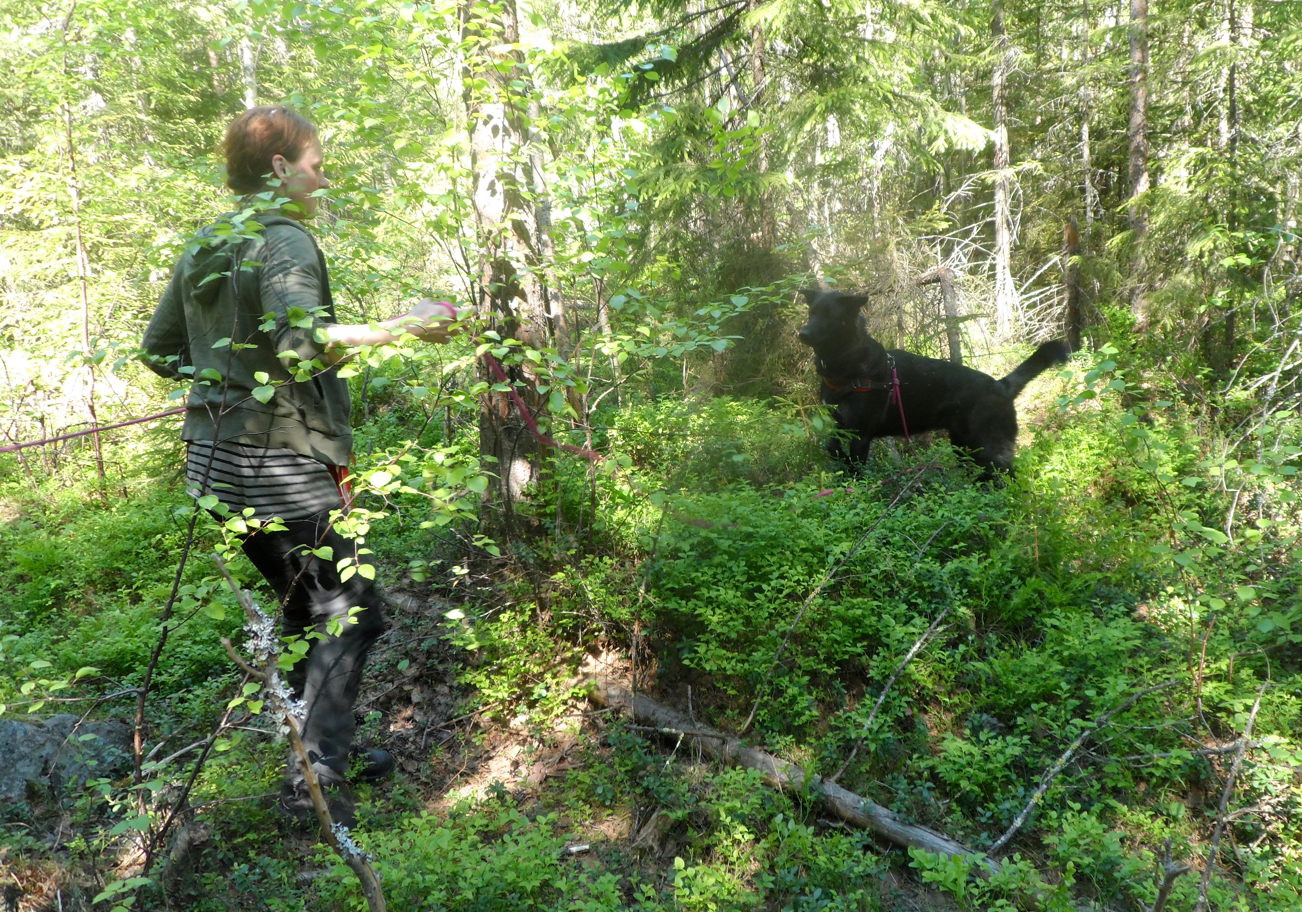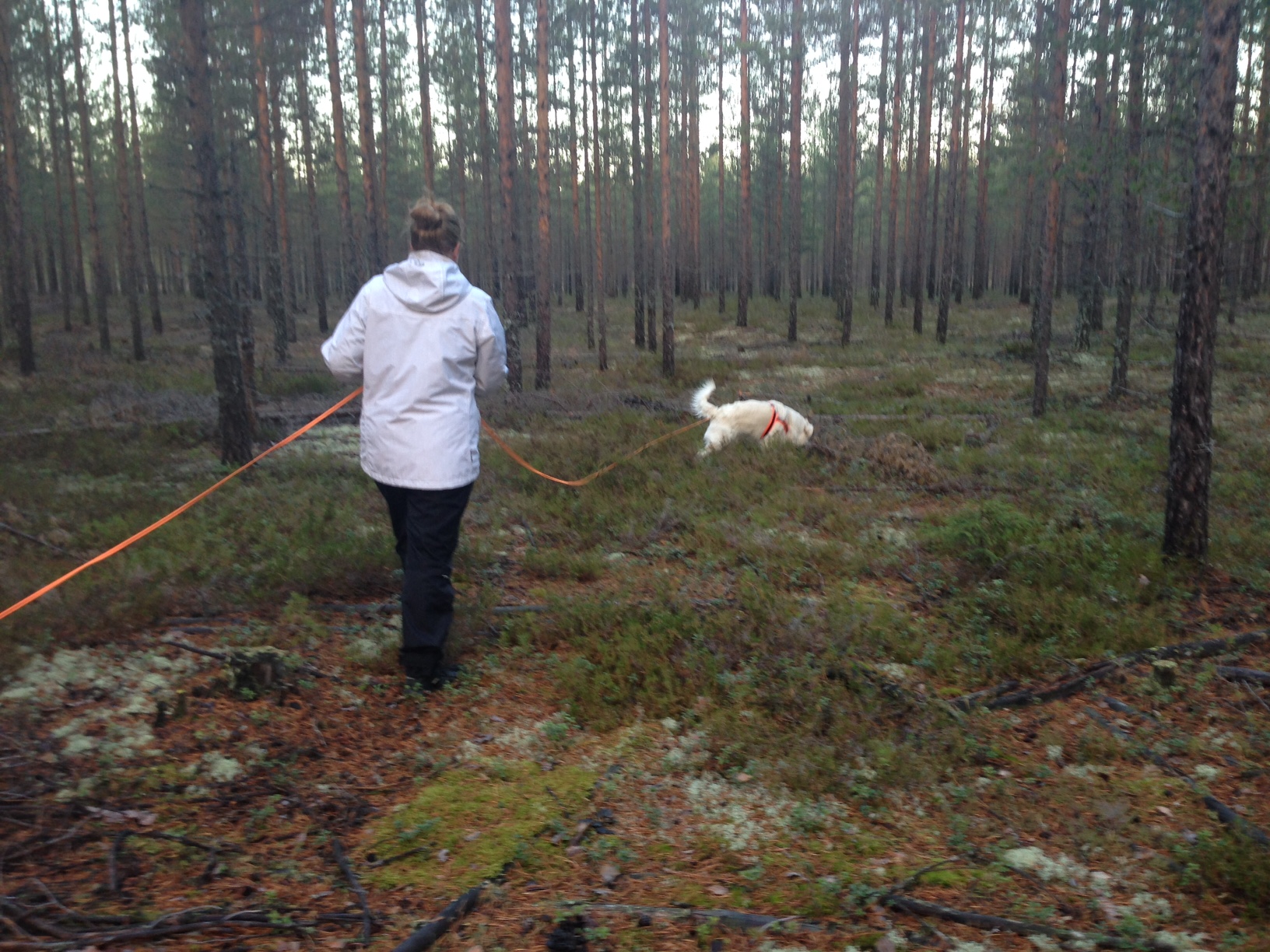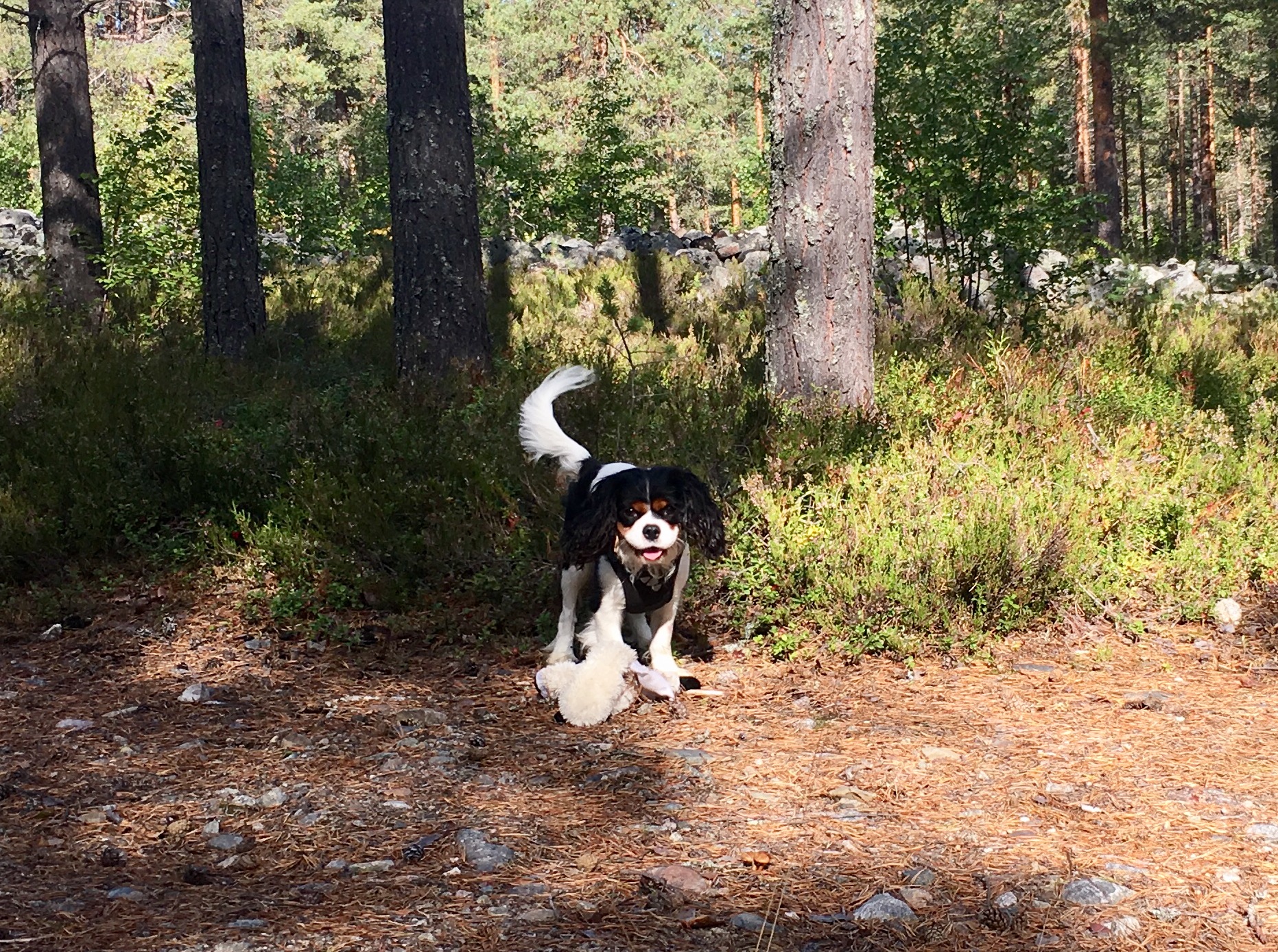 Vante fick börja. Han är idag elva år och vad jag kan minnas har han aldrig fått testa på ett viltspår. Han var full av förväntan fastän han inte hade en aning om vad som väntade. Jag gick med honom i koppel till stället där jag hade börjat dra klöven, selade på honom och satte på spårlina. Sedan visade jag med en handrörelse ned mot där klöven hade dunsat i marken första gången. Han sniffade lite avslappnat. Sedan kände han den där spännande doften och gick genast igång. Med full koncentration och fokus följde han spåret genom skogen. Det var en fröjd att se. Sedan kom han fram till platsen där jag hade knutit fast klöven i ett träd. Han luktade nyfiket. Jag knöt loss klöven och drog lite retsamt. Då vaknade vilddjuret i honom! Häftigt att se. Vilken lycka att få gnaga på detta ben. Vante var så lycklig. Han till och med rullade sig på benet för att verkligen gnugga in doften. Sedan bar han hem det med en mallig knyck på nacken.