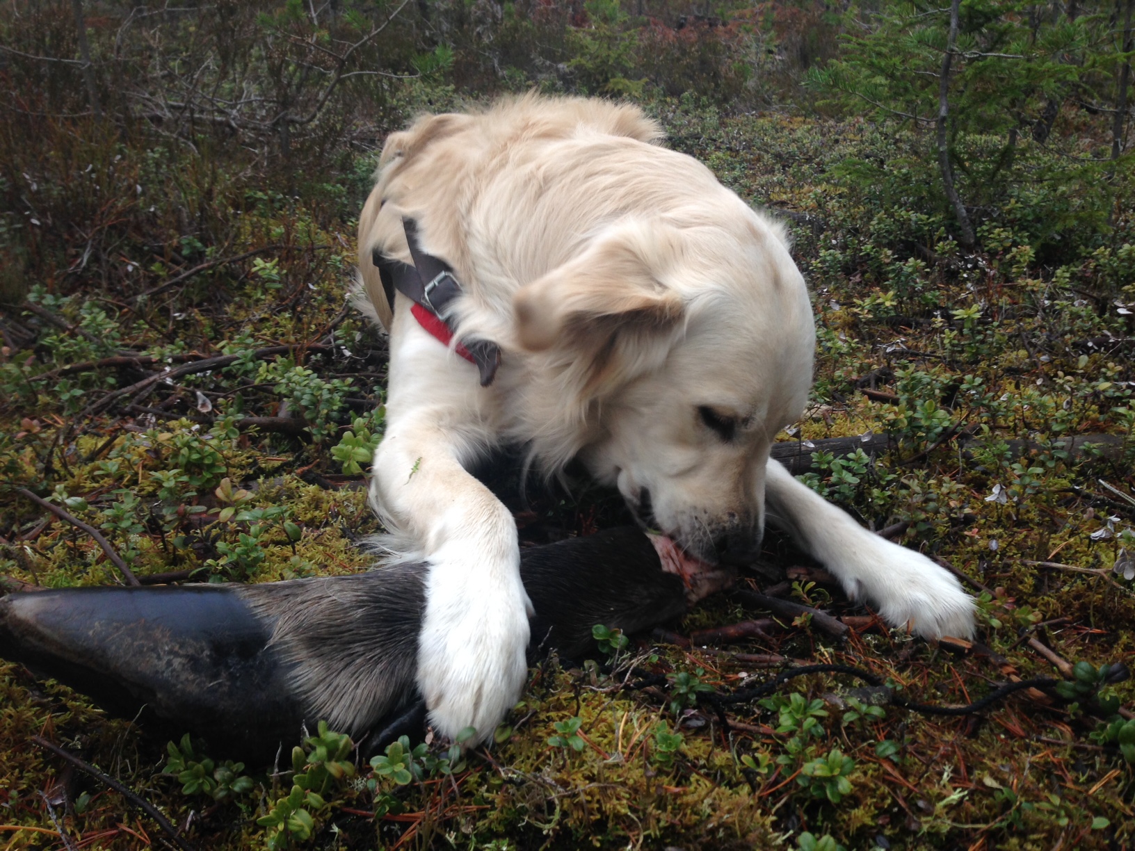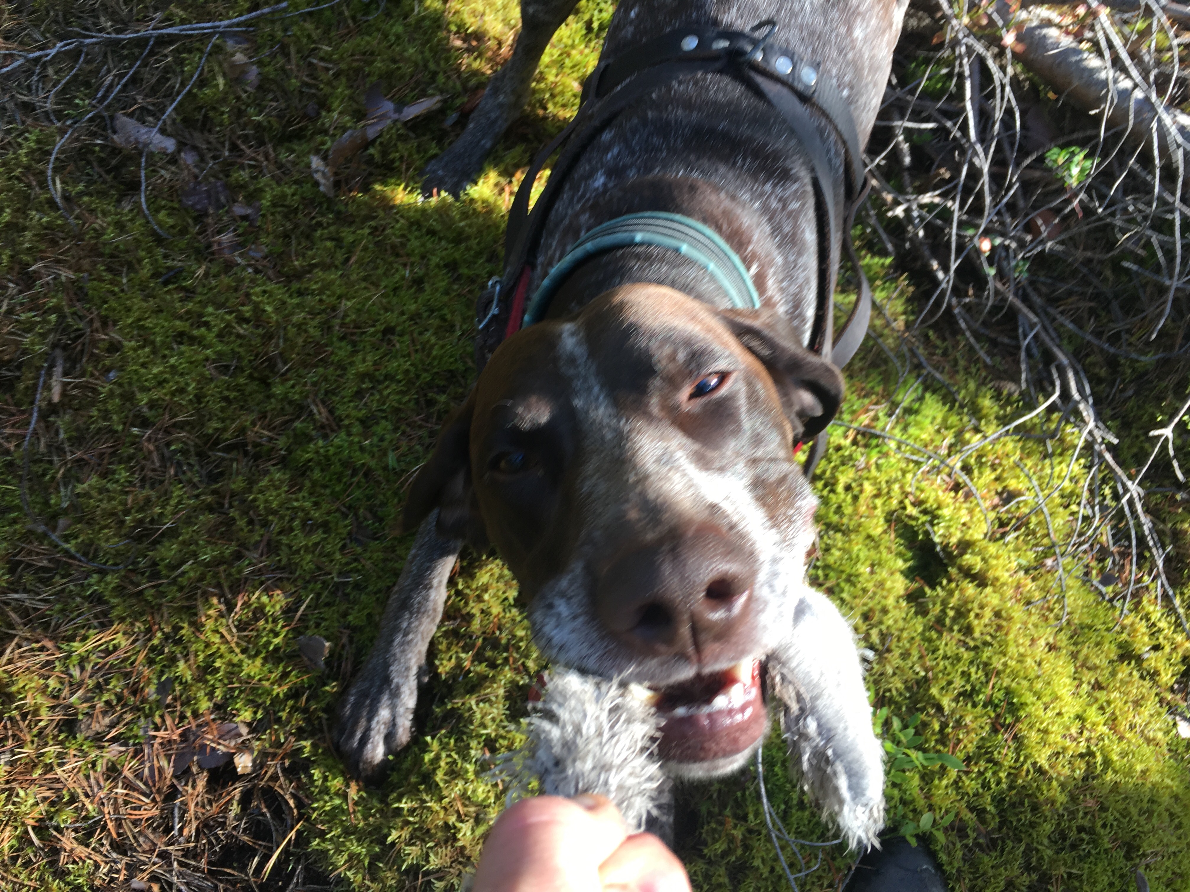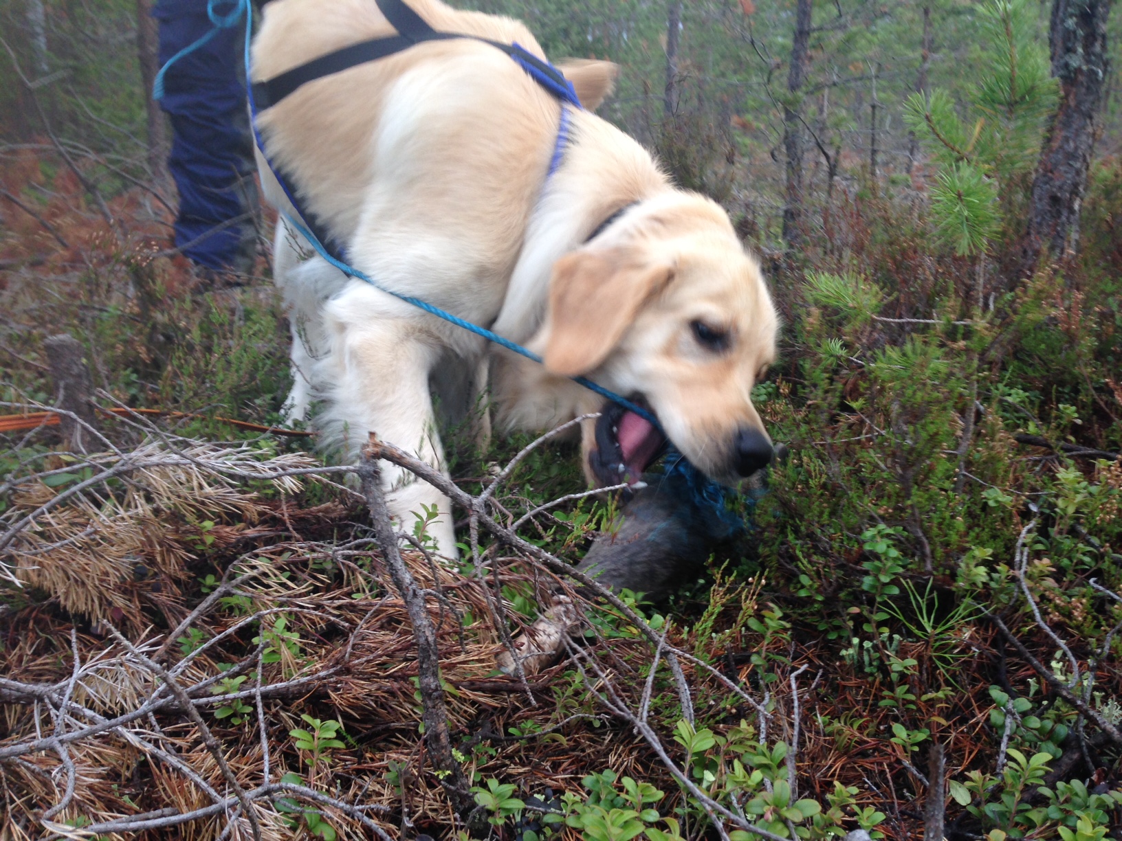 Slutligen var det Flingas tur. Hon har ju gjort det här några gånger förr. Både med klöv på slutet och förra hösten hittade hon en hel kalv då hon redde upp situationen efter ett skott. Nu spårade hon med stort fokus och intresse. Men när hon kom till slutet blev hon nästan besviken. Bara en futtig klöv? Inte en riktig kalv? Nåja, när jag drog igång och lekte med klöven blev det roligare och hon bar den hem med ett flåsande.